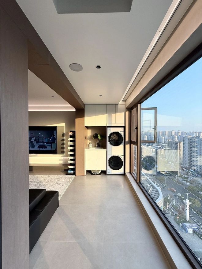 1)利用烘干机解决日常的晾晒需求,这应该是最常见的做法,衣服洗完直接烘干,再收进衣柜,彻底将阳台释放出来。