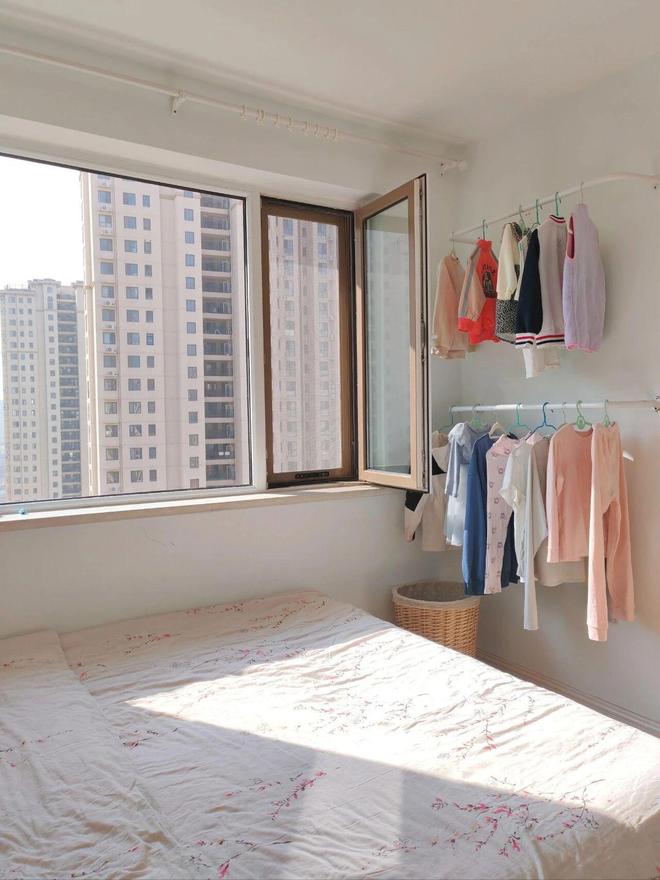 一是在原阳台半窗的位置安装了一根长长的晾衣杆,专门用来孩子的衣物。简单、实用,又不显乱。