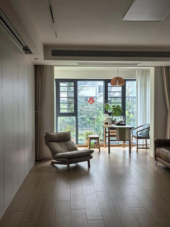 网友@lift就做了这样的设计,并通铺了柔光地砖,安装了落地玻璃窗,再加上2楼自带窗景,整个空间都有了呼吸感。
