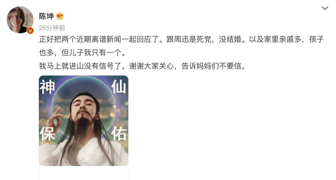 记得2023年有人传陈坤和周迅结婚,他立马出来辟谣:"跟周迅是死党,没结婚。家里亲戚多,孩子也多,但儿子我只有一个。"这话说得,既澄清了谣言,又表达了对儿子的爱。
