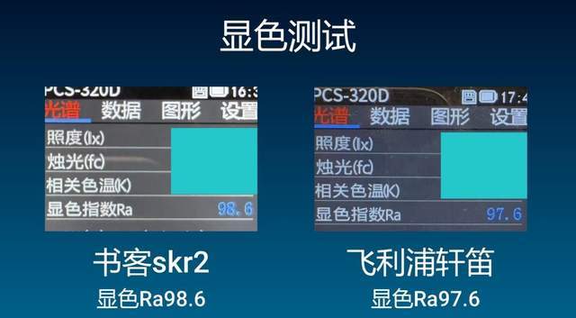 书客SKR2和飞利浦轩笛都属于同价位中较为出色的水平。显色指数越接近 Ra100,画面色彩的还原度就越高,屏幕上的文字、图片和细节看起来也会更自然。实测来看,书客SKR2的显色指数略高于飞利浦轩笛,颜色层次更完整、偏色更少,在长时间面对屏幕时视觉负担相对更轻。而飞利浦轩笛的显色表现也能满足日常办公和娱乐需求,只是在色彩还原的细腻度上稍逊一筹。