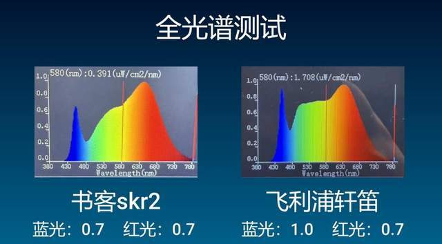 从实际的全光谱测试结果来看,在蓝光控制这一项上,书客SKR2的表现明显更占优势。它的蓝光数值处是最低水平,主要得益于所采用的SpectraBlue 2.0光学技术,对短波段蓝光进行定向削减,实测可将潜在蓝光危害降低约64%。在长时间对着屏幕使用时,整体刺激感更低,不容易视觉疲劳。相比之下,飞利浦轩笛在蓝光抑制上的表现就比较一般,实测蓝光含量约为1.0,数值偏高,短时间使用问题不大,但如果是长时间办公或游戏,对眼睛的友好度相对会弱一些。