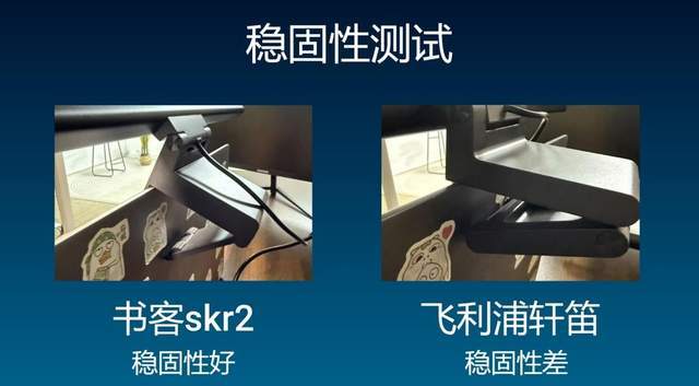 测试的时候同样力度推三次,书客skr2的稳固性比较高,除了轻微的晃动外没有什么变化,稳定性没什么问题。但是飞利浦轩笛会掉落下来,后面的挂夹相对来说比较卡不住,容易掉落的时候砸到屏幕,尽量适合比较少外力的环境使用。