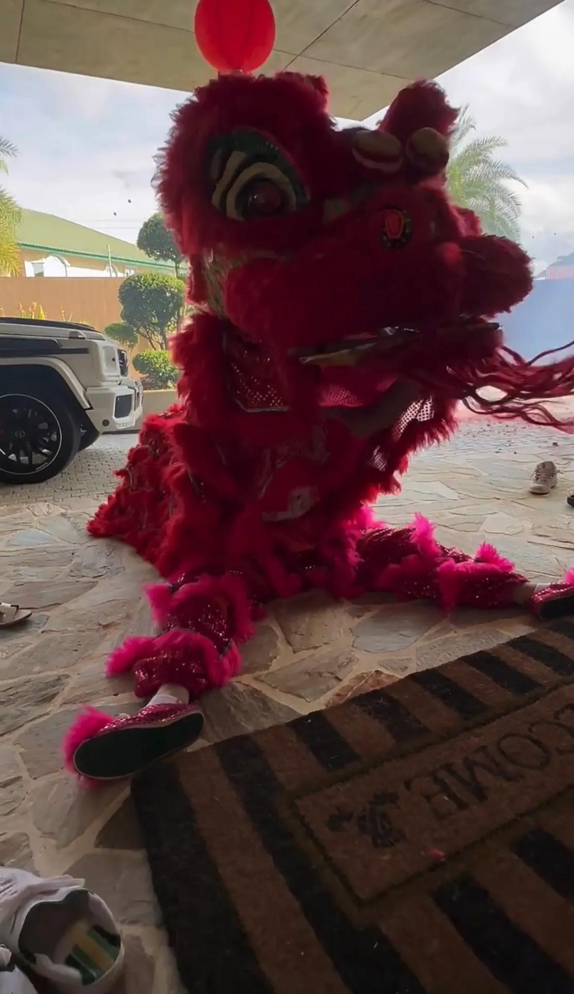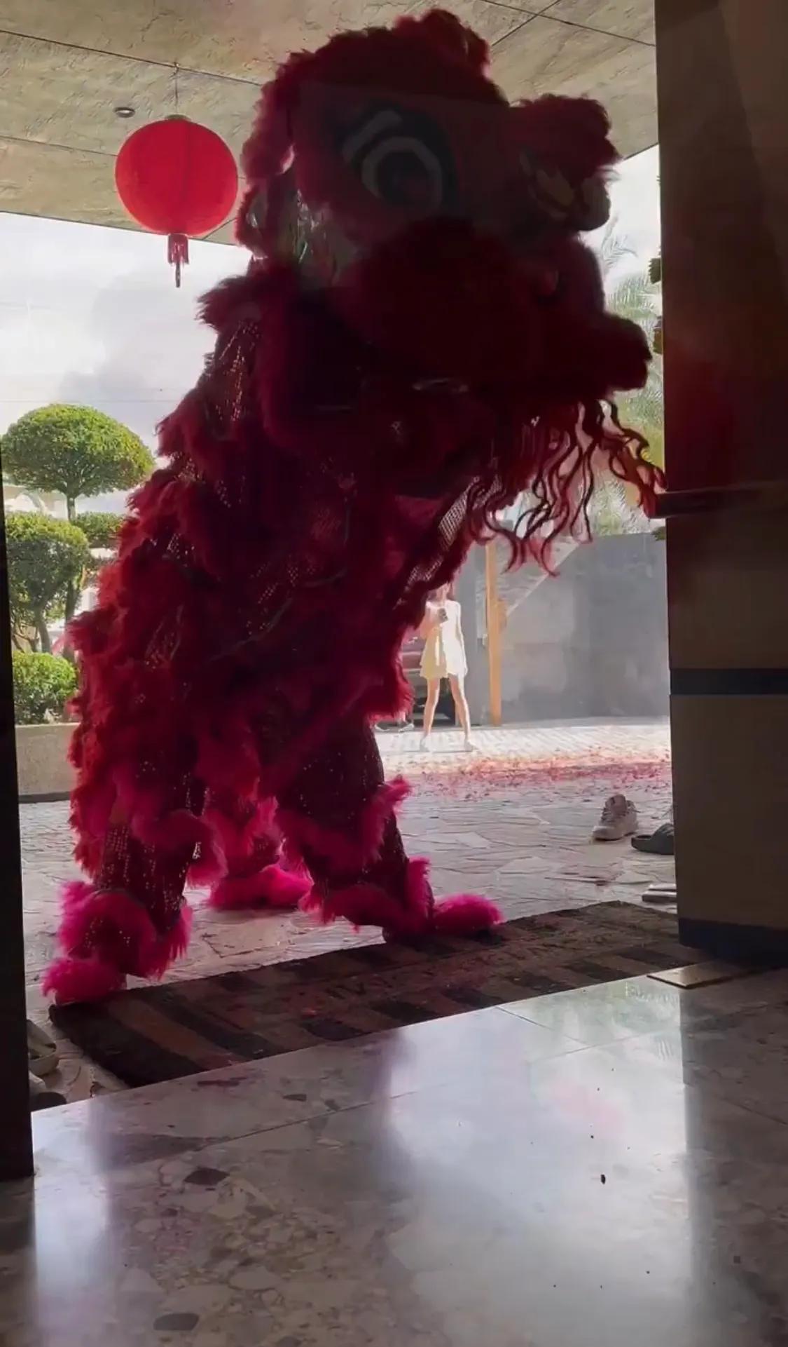 吴尊把大红包塞进了舞狮的嘴里,过年在家里舞狮太喜庆热闹了,吴尊一家新年一定会生活顺利,幸福美满的。