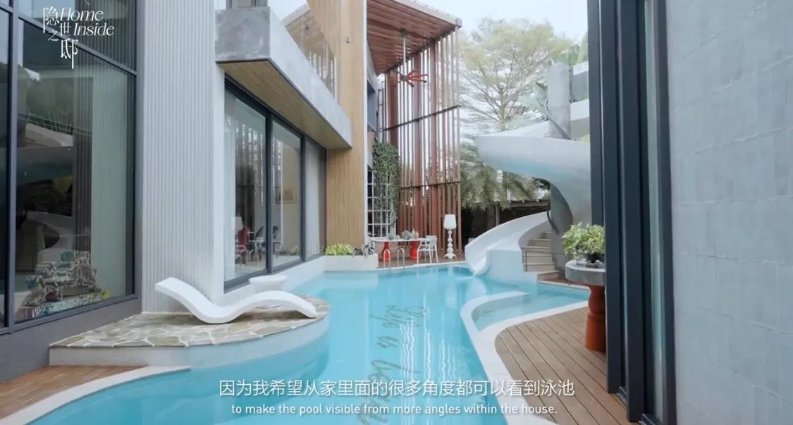 Max舞狮,吴尊则在旁边打鼓,父子俩配合的非常默契。在吴尊身后就是他家的游泳池,这个泳池非常的漂亮。吴尊把游泳池设计在家里的中心,在家里的各个位置都可以看看到泳池。泳池上面还有一个滑梯,外面全都镶嵌着珍珠白的马赛克,看着像一件艺术品。