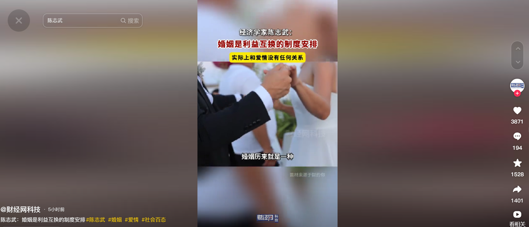 经济学家陈志武就说了自己的观点,认为婚姻是利益互换的制度安排,实际上和爱情没有任何关系,也是很大的争议。