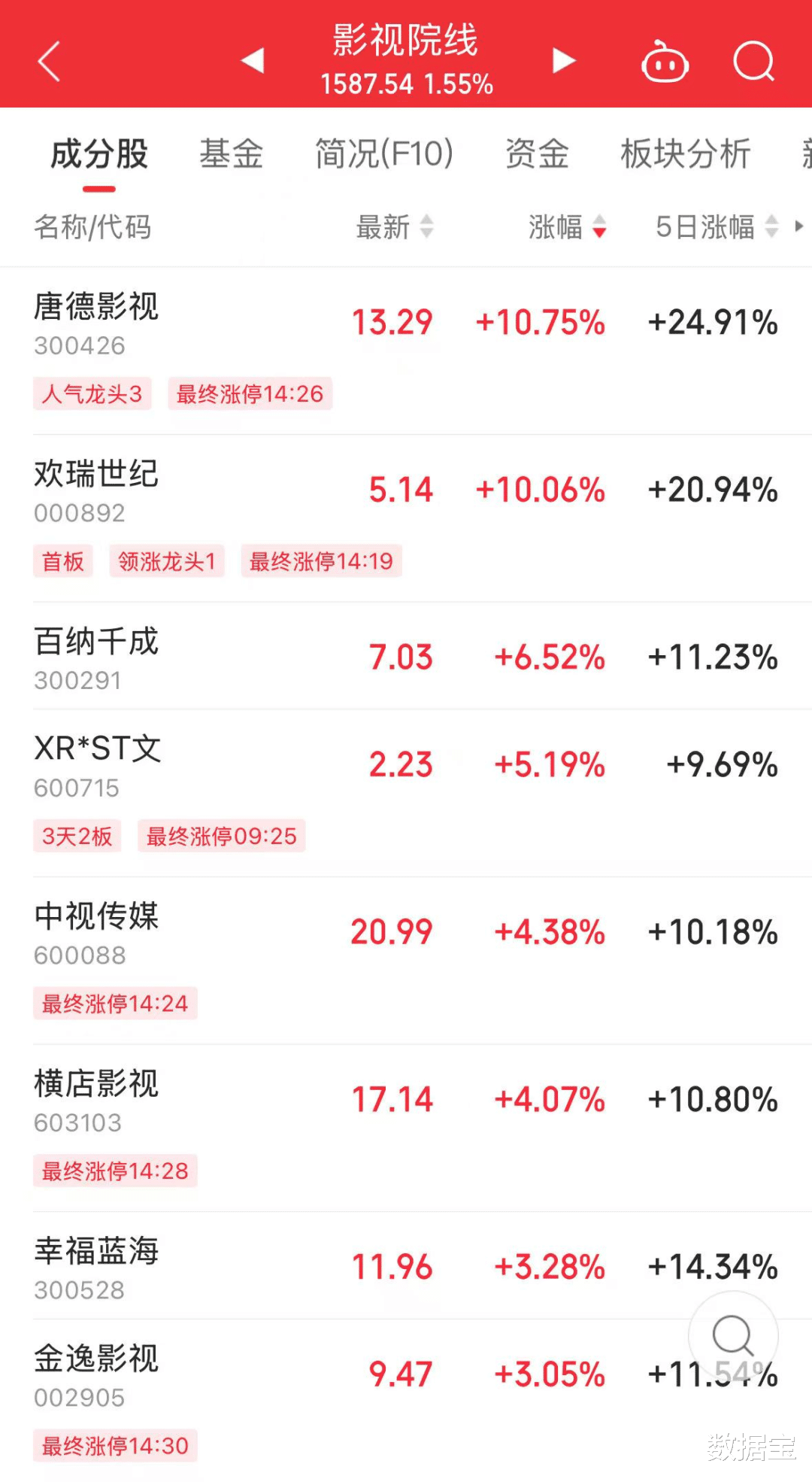 截至收盘时,欢瑞世纪封住涨停,涨幅靠前的影视股还有唐德影视、华闻集团、百纳千成、龙版传媒、内蒙新华等。