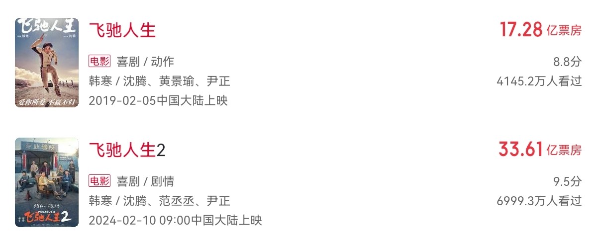 韩寒+沈腾这一组合,除了《四海》翻过车,《飞驰人生》系列一直都是春节档的扛把子。