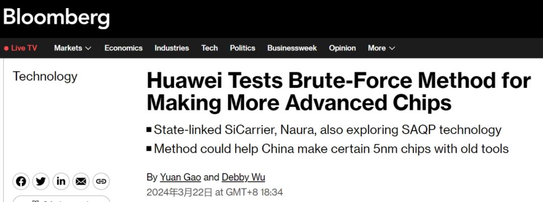 彭博社早在2024年就发布了相关报告,报告指出华为正在联合本土的芯片企业,在有限的设备下通过传统的技术方法尝试制造5nm芯片。这种方法无异于霸王硬上弓,目前在国际层面还没有企业能够成功。台积电、三星、英特尔均已经转向EUV技术,中国企业是目前唯一一个用DUV光刻机冲击5nm芯片的企业。