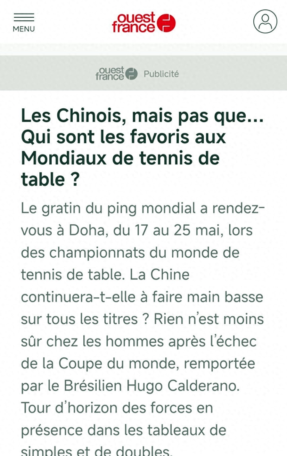 即将到来的2025年多哈世乒赛,牵动着全球球迷的心。法国发行量最大的权威媒体——法兰西西部报,近期发布了对本次世乒赛男单和女单冠军的预测,其中一些预测结果令人意外。让我们一起来看看欧洲媒体眼中的世乒赛格局。