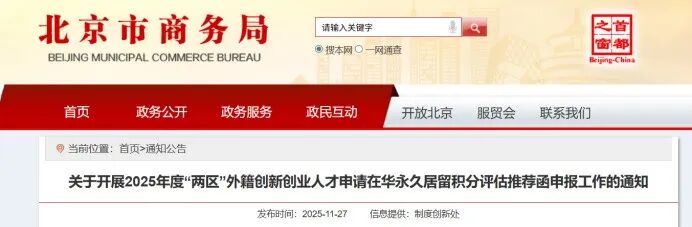 2025年11月27日,北京市商务局发布通知,启动北京市“两区”(国家服务业扩大开放综合示范区和自由贸易试验区,以下简称“两区”)外国创新创业人才推荐函申请永久居留积分评估工作。