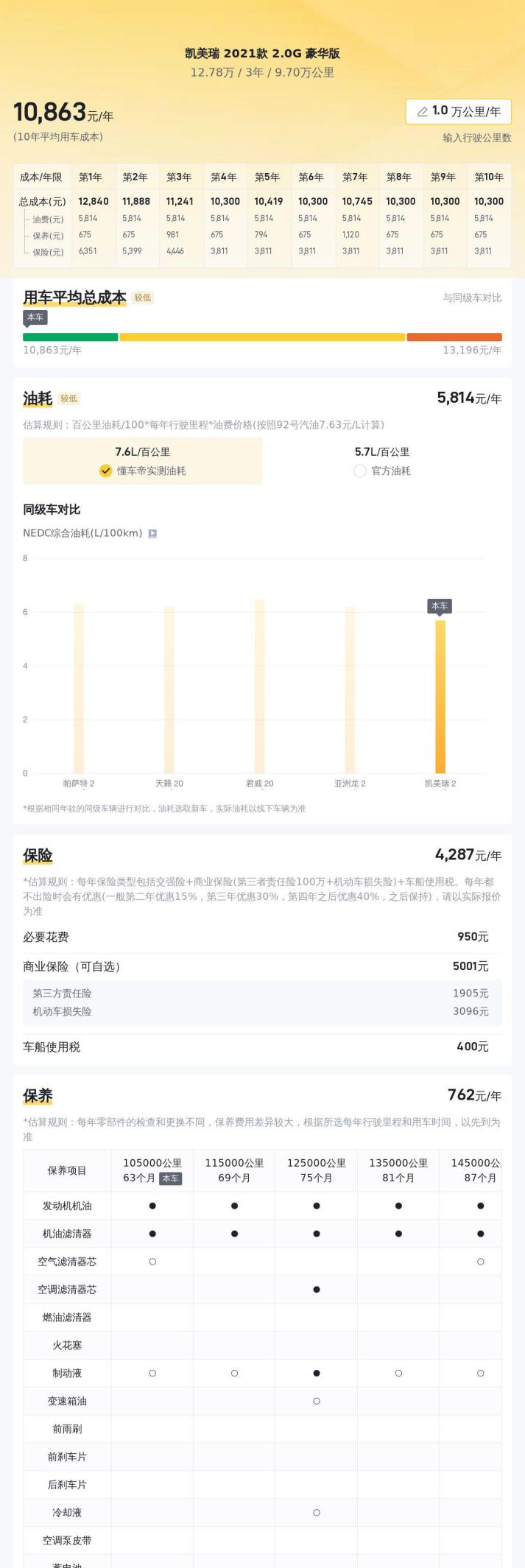 说到用车成本,这恐怕是每个车主都绕不开的话题。根据估算,这辆凯美瑞每年行驶2万公里,燃油费用约为8800元,保养费用大约1800元,保险费用参考值为4600元,总计约15200元。当然,这只是一个预估值,实际费用会根据个人驾驶习惯、油价波动、保养内容和保险方案等因素有所变化。但总体来说,凯美瑞的油耗和保养成本在同级别车型中属于比较低的水平,对于注重经济性的消费者来说,是一个不错的选择。