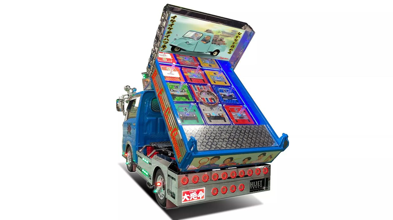 车尾的设计更是充满巧思与细节,后保险杠上整齐排列着14颗圆形LED尾灯,点亮后形成独特的灯光矩阵,彻底打破了轻自动卡车朴素的固有印象。货厢部分堪称“移动纪念馆”,上面用手绘图案完整呈现了历代车型的演变历程,还特意加入了复古车型Midget的致敬元素,在炫目的外观下暗藏对品牌历史的温情。