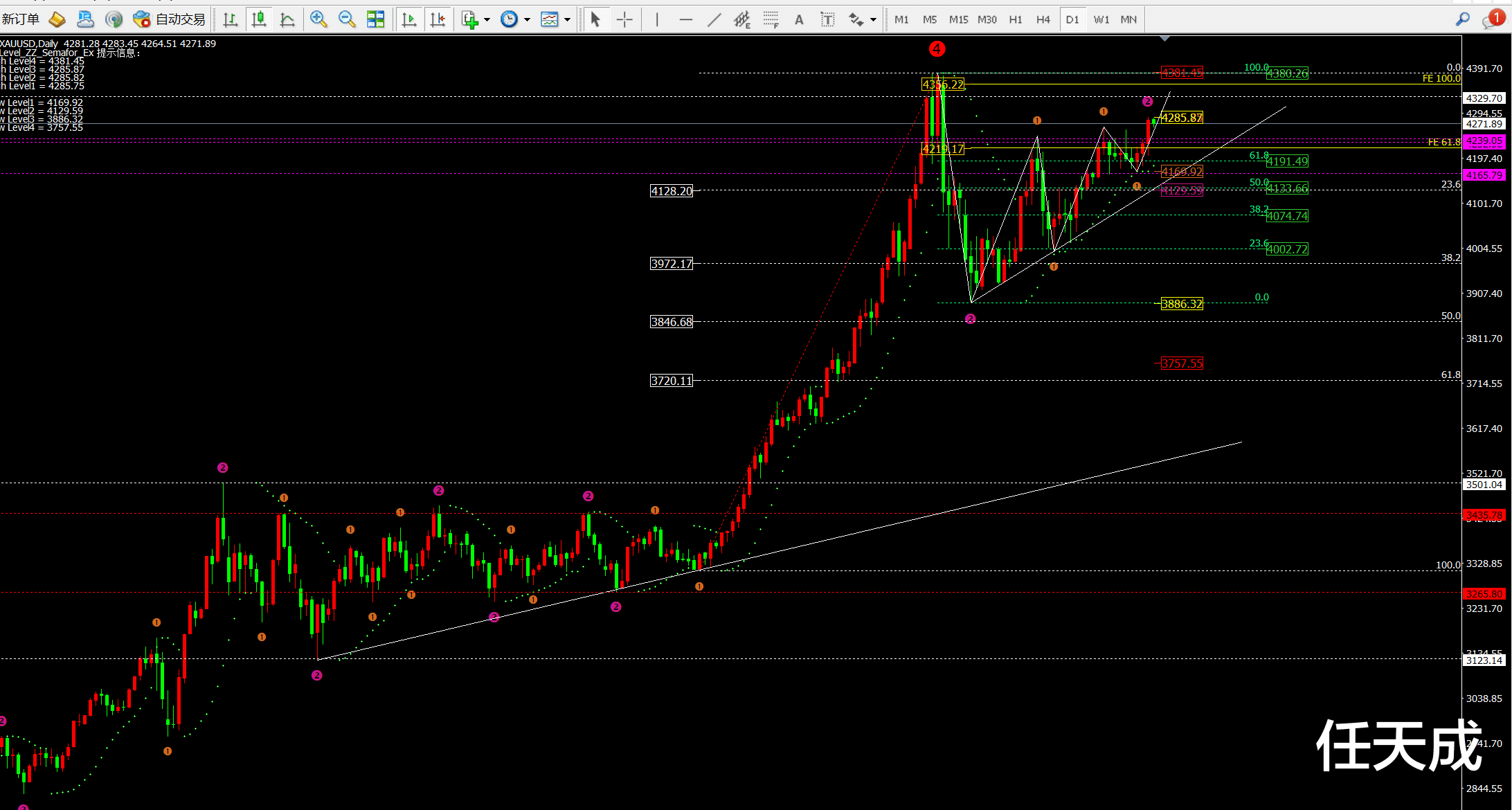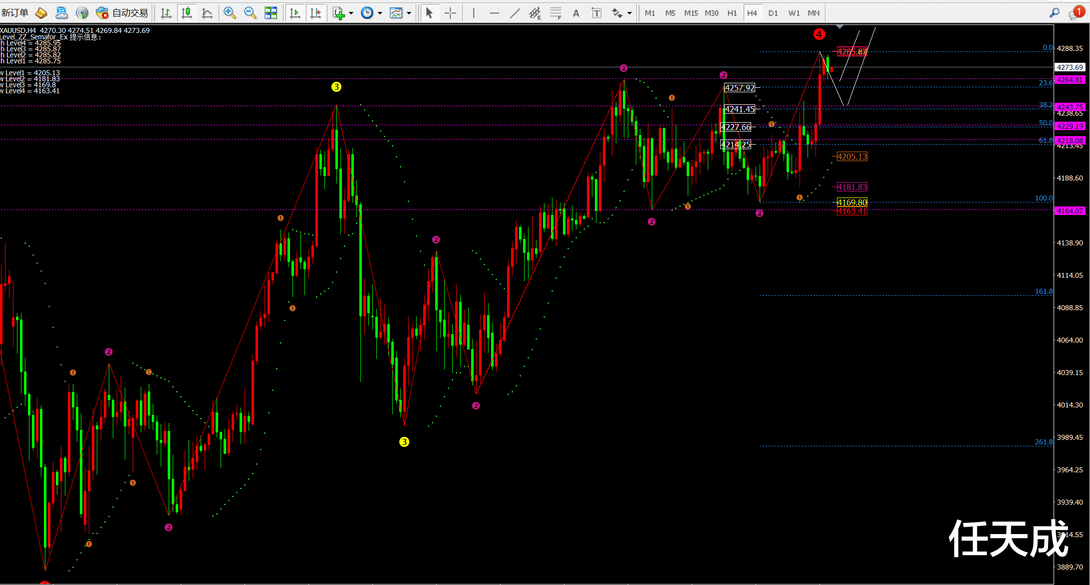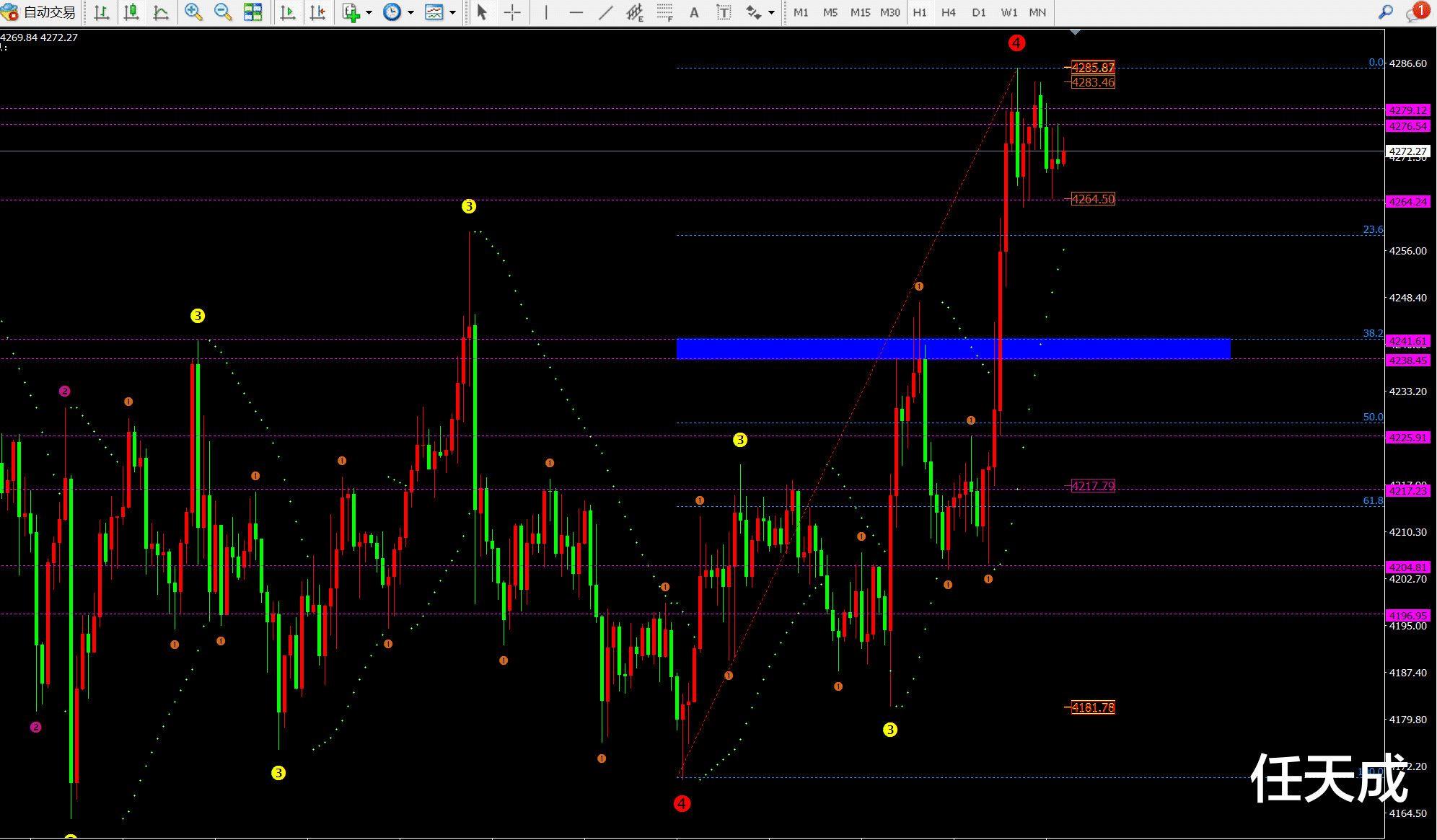 【3】 早间上破4285后回落4276-78追多,防守4265,目标看4300-4310