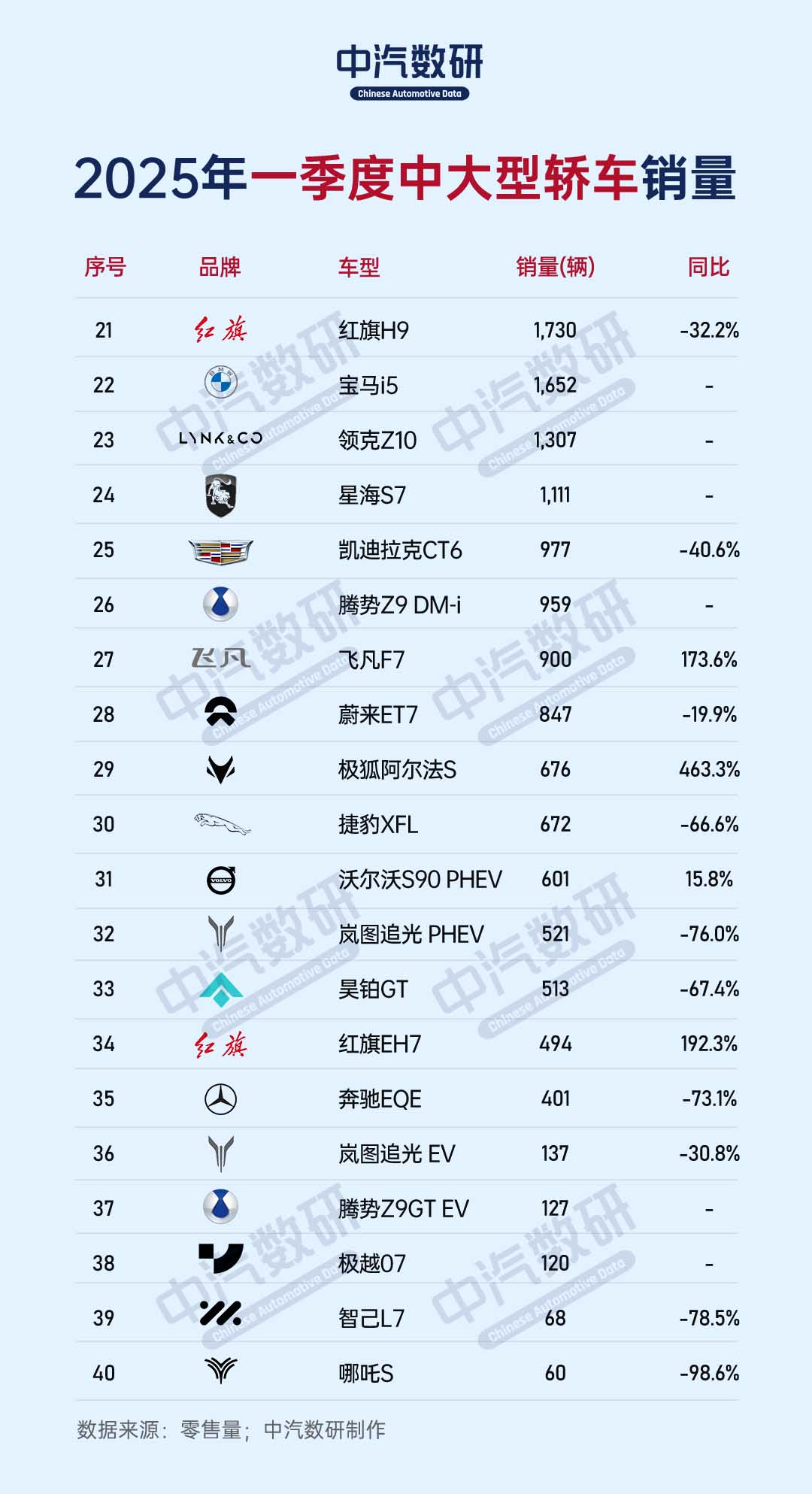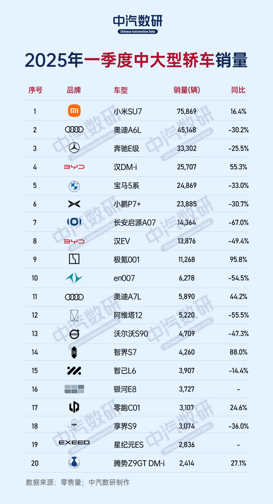 乘联会公布销量数据显示,2025年一季度国内中大型轿车市场零售销量28.9万辆,同比大涨53.3%。新能源车型在这一领域表现抢眼,而传统豪华品牌则努力坚守阵地。