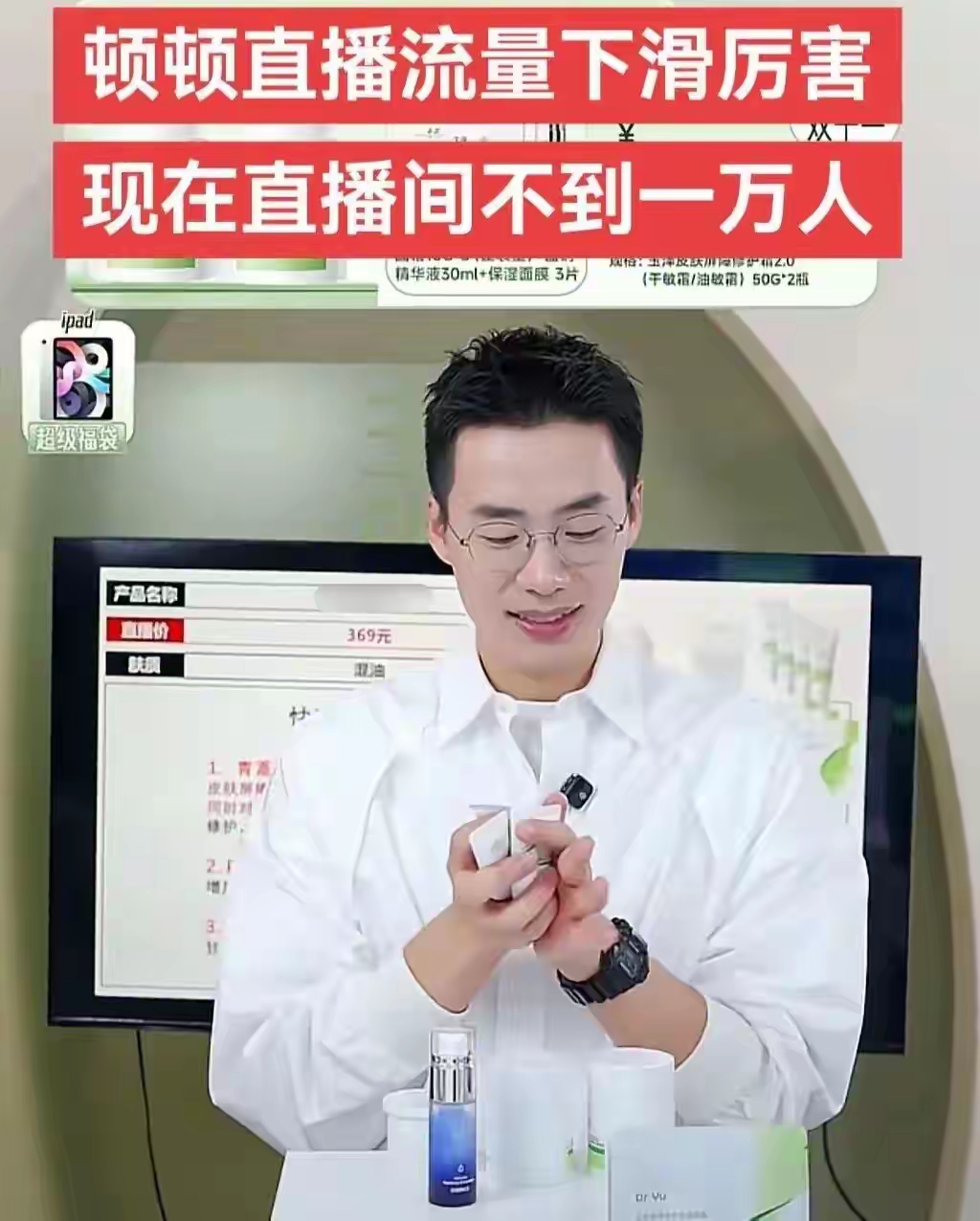 首秀之后,数据直接塌了。之前几万人在线,后来就剩几千。双十一那种大场,提前十天预热,秒杀品五万份,红包砸一千万,还有iPad福袋、平台补贴,结果最高也就一万来人在线,还时不时往下掉。连卖护肤品的“与辉同行小将”都比不过。目标几千万GMV,实际连一千万都没稳住,下播后他自己都闷了好久。