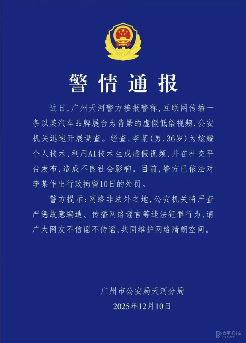 2025年广州车展期间,小鹏汽车就有人利用AI技术生成虚假视频向公安机关报案。12月9日晚,小鹏汽车法务部官方微博发布声明,该案件现已侦破,涉案男子李某被公安机关处以治安拘留10日的处罚。