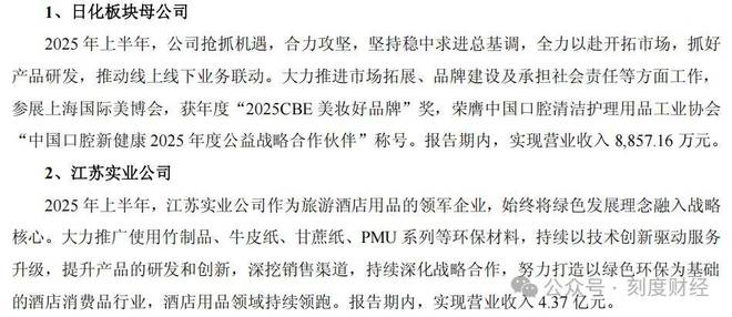2025年上半年,控股子公司江苏实业作为日化板块的核心支柱,实现营收4.37亿元、净利润644.03万元,主要依赖酒店用品与基础口腔护理产品的销售。母公司日化板块营收仅8857.16万元,芳草公司营收1530.02万元,传统优势品牌的市场影响力持续弱化。