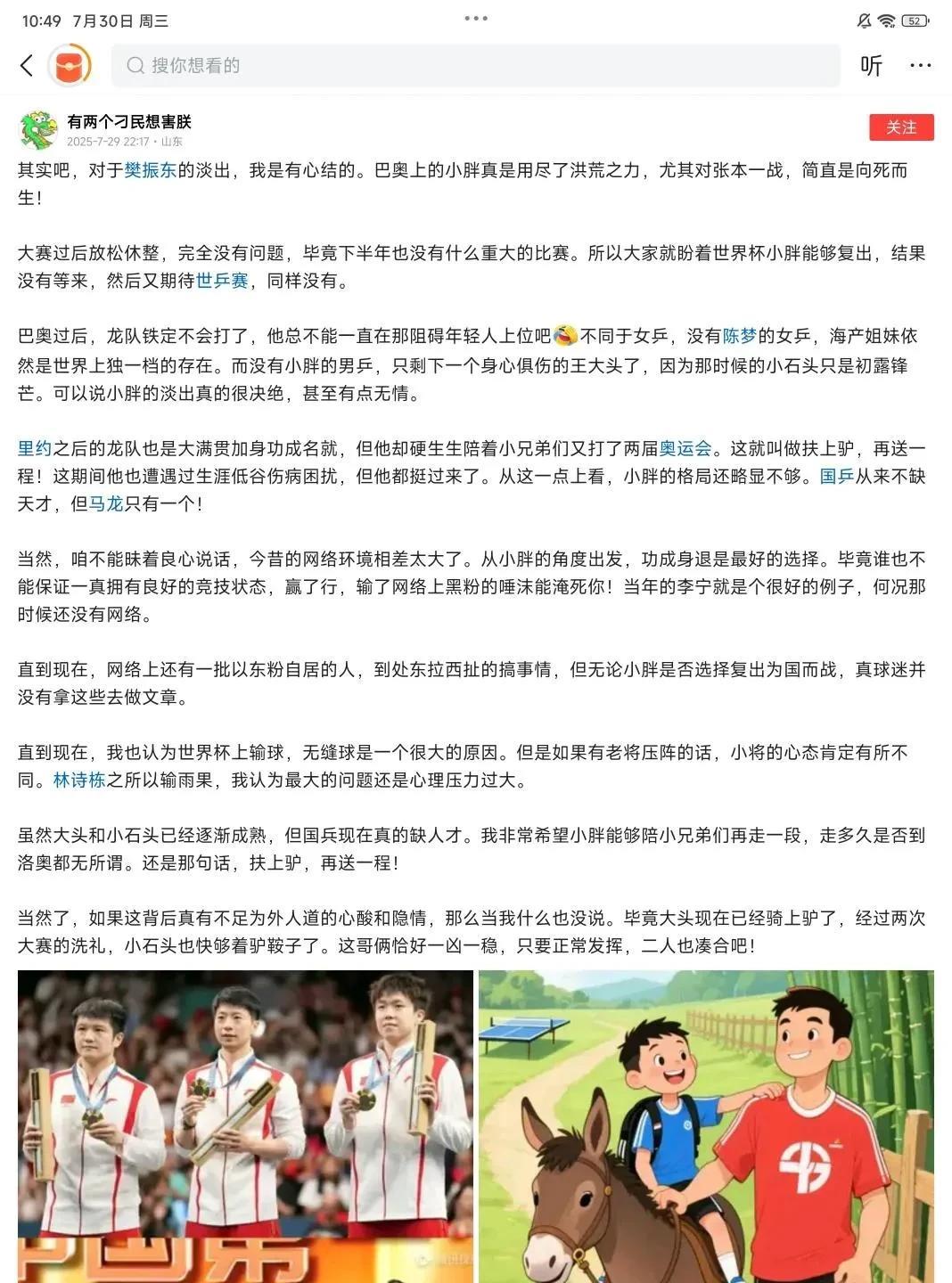 写了这么长的评论,我也愿意给更多的人看到,以下是在我一篇文中 网友问我对图片观点的看法: 18年亚运会,20岁的樊振东首次作为领军人物带队征战雅加达,没有谁会觉得樊振东可怜,当时王楚钦输给台林,樊振东一单两分助团体赛拿下胜利。 21年休斯顿世乒赛,当时东奥后马龙休息了半年,樊振东带队王楚钦、林高远、梁靖崑他们征战休斯顿,樊振东还被骂了几年,舆论都说搬了马龙名额,但根据三条规则,马龙当时确实没拿到名额。 休斯顿男双是小胖头,王楚钦输掉单打后影响了双打(来自乒乓世界采访),男双止步八强,而这个输掉的男双也是樊振东11年国际生涯中三大赛唯一输掉的男双。 22年亚洲杯,马龙樊振东的名额给了王楚钦林高远,打得怎样不予评论。 22、23年两届新加坡大满贯,男双小胖头都是卫冕冠军,24年胖头亚军输给龙远。 以及23年杭州亚运会男双小胖头冠军,24年釜山世乒赛一单两分挽狂澜。 而巴黎,他有多少压力来自于他成了独苗! 从东京之前到整个巴黎周期,樊振东和王楚钦男双拿了那么多冠军,单打大赛也曾一次次收拾残局。 这些还不够吗? 我不知道到底怎样才叫带? 樊振东带队打亚运会时,他才20岁,带队打休斯顿世乒赛时他24岁,大家都知道那是机会。 王楚钦今年也25岁了,巴黎之前他的状态非常好,也世排第一了,所有人都对他寄予厚望。 是不是如果一直没拿到大赛冠军就一直要人陪着带着? 归根结底,我想还是世界杯输雨果一事,让球迷对他的实力不够自信,但竞技体育输赢的因素是多样的,他的实力是值得他球迷更多的信任的。 13年,马龙25岁,王皓挡了马龙三届世乒赛决赛之后,在那一年终于退役,马龙说:谢谢王皓终于退役了。 马龙球迷不会去骂王皓不带马龙。 21年休斯顿,马龙也休息了半年,无论什么原因,樊振东的第一个世乒赛冠军确实是在马龙没有参加的情况下拿到的。 樊振东球迷不会去骂马龙不带樊振东。 大树底下无大草,别人为你遮风避雨,别人一样让你不见天日,哪有两头甜? 另外,所有忽略原因和过程去谈结果,都是耍流氓。 巴黎周期的身心消耗现在所有人也看到了,另一个原因是他被w t t被动逼退,人家要对他高额罚款,他能有什么选择? 所有跨过这两个原因,指责他不带王楚钦的人,受害者有罪论。 你告诉他,如果有一天他的孩子在学校被同学期负到快要抑郁了,他要告诉孩子一定要忍,千万不能出声、不能反击、不能报警、更不能转学。 不去指责施暴者,反而去指责受害者是为什么? 是因为那些人本身就是施暴者、甚至是得利者,所以他们更希望看到被网暴者始终沉默。