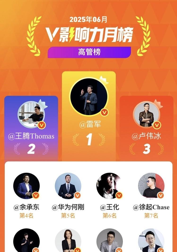 太不容易了,微博影响力高管榜单,余承东击败雷军,位列榜单首位了。要知道,上个月余承东仅排名第四,不及位列前三名的雷军、王腾、卢伟冰。经过一个月的努力,余承东更新内容频繁,视频发布量明显提升,就上来了。还是应了那句话,科技数码汽车圈,在流量方面能与雷军对决的,恐怕只有余承东了。#头号创作者激励计划#