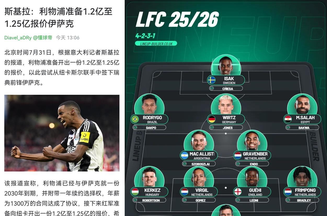 重磅的天价转会要来了,利物浦已经把报价提高到1.2-1.25亿英镑了,欧元估计已经打动不了纽卡斯尔了。 话说利物浦这都准备好多天了吧?怎么准备到现在还不出手?现在卖迪亚斯的钱也到账了,还在犹豫什么? 现在对利物浦来说买伊萨克的钱不是问题,现在问题是看纽卡到底放不放人了,利物浦和伊萨克本人都有意促成这笔交易,只等纽卡高层点头。 今年利物浦转会窗这么大的阵仗压力拉满,斯洛特你可得撑住啊,明年才是你真正的大考时间。