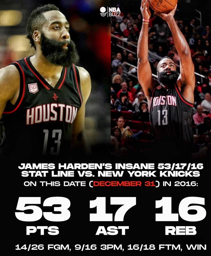 哈登自媒体更新社交媒体,晒出詹姆斯-哈登的神迹。 其具体发生于2016年12月31日火箭对阵尼克斯的比赛,该场比赛中哈登全场轰下53分,17助攻,16篮板,投篮26投14中,三分16投9中,罚球18罚16中,并且率队取胜。 该媒体配文:“至今想不通哈登如何做到的。”