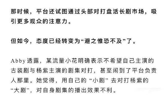 她觉得,用自己的“小剧”去对打杨紫的“大剧”,对自身剧集的播出效果不利。