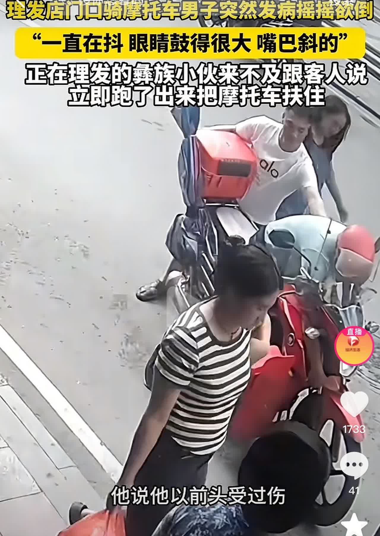 活该老板发大财! 7月31日,四川凉山,理发店门口一名骑摩托车男子突然发病,正