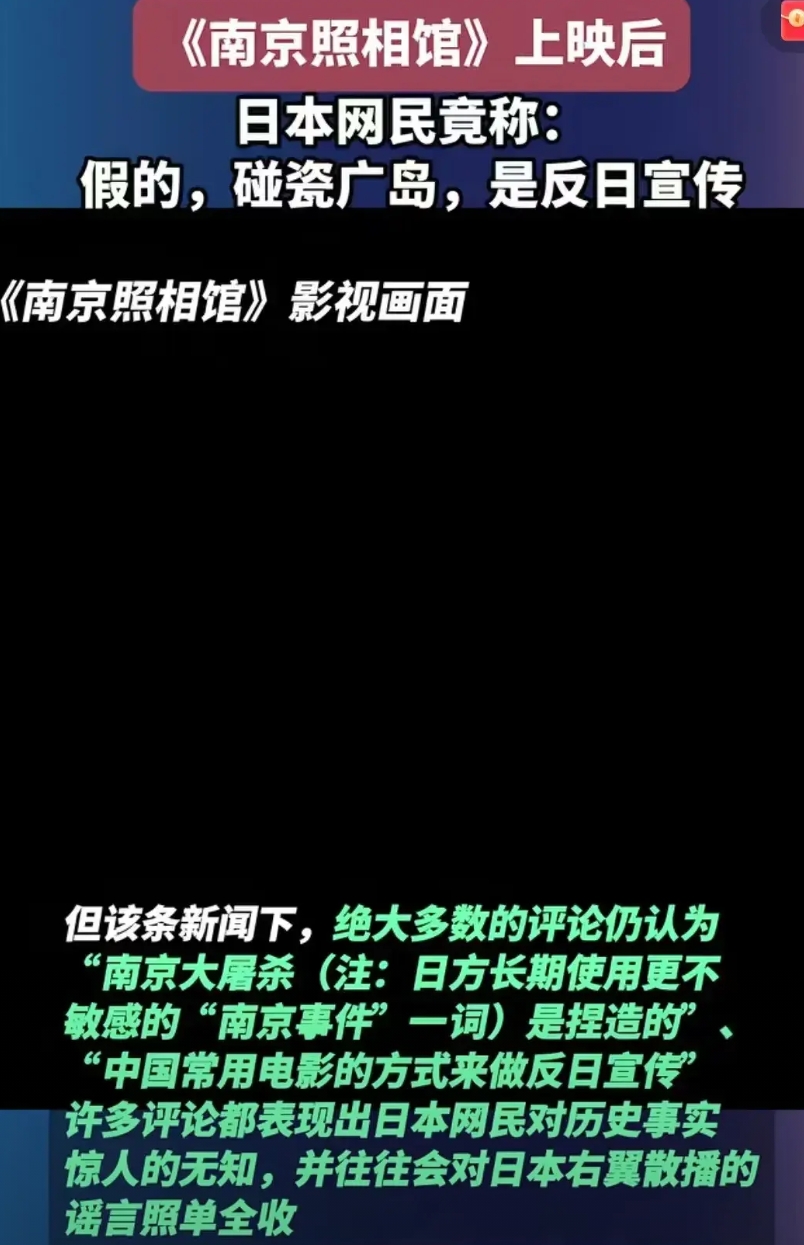 日本网友称电影《南京照相馆》是反日宣传,很多日本网友疯狂否认南京大屠杀,说这是仇恨宣传,甚至日本政客直接下场叫嚣南京大屠杀根本不存在,它说因为日本军队是世界最绅士的军队,恪守“不杀、不奸,不烧”三戒! 其实日本人有这种反应不奇怪,因为它们的本性使然,总有一天会血债血偿的,最让人痛心的是我们国内,某些群体也配合着日本在网上四处留言说这是反日电影,破坏友谊,还有的说电影画面残忍,不要带小孩去看,这些人还是中国人吗,配合着日本人带节奏,每次看到这种评论,真的气炸了!