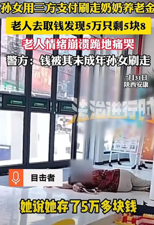 老人存了五万多的养老钱,去银行查看时,发现只剩5.8元,老人疑惑钱哪里去了?银行工作人员帮着查询以后,告之老人,钱是被人充入游戏中了。 老人急切报警后,才发现是孙女通过第三方支付刷走了老人的钱。 第三方支付,谁又能说的明白,是不是老人付的呢? 老人能积攒下几万块钱是多么的不容易,没想到就样没了,气的躺在银行大厅的地上哭泣。 建议老人去找记者,让记者帮着找游戏平台,帮着申请退款。 不给孩子玩大人的手机,不给孩子的手机绑定银行卡,甚至不给孩子玩游戏,这是杜绝此类事情发生的唯一方法。 长辈疼爱晚辈也要有个度。 可怜,可怜!
