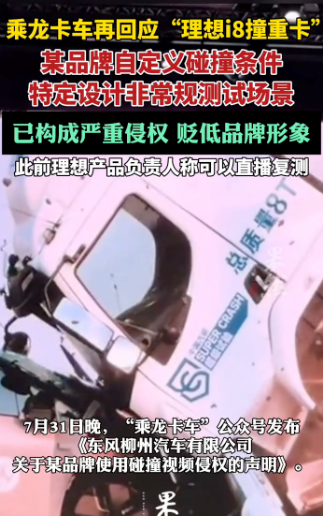 7月30日,乘龙发布了声明,称此事已构成严重侵权,远超正常商业竞争范畴。该行为严重误导和损害公众知情权,对东风柳汽的品牌及商业名誉造成巨大负面影响。