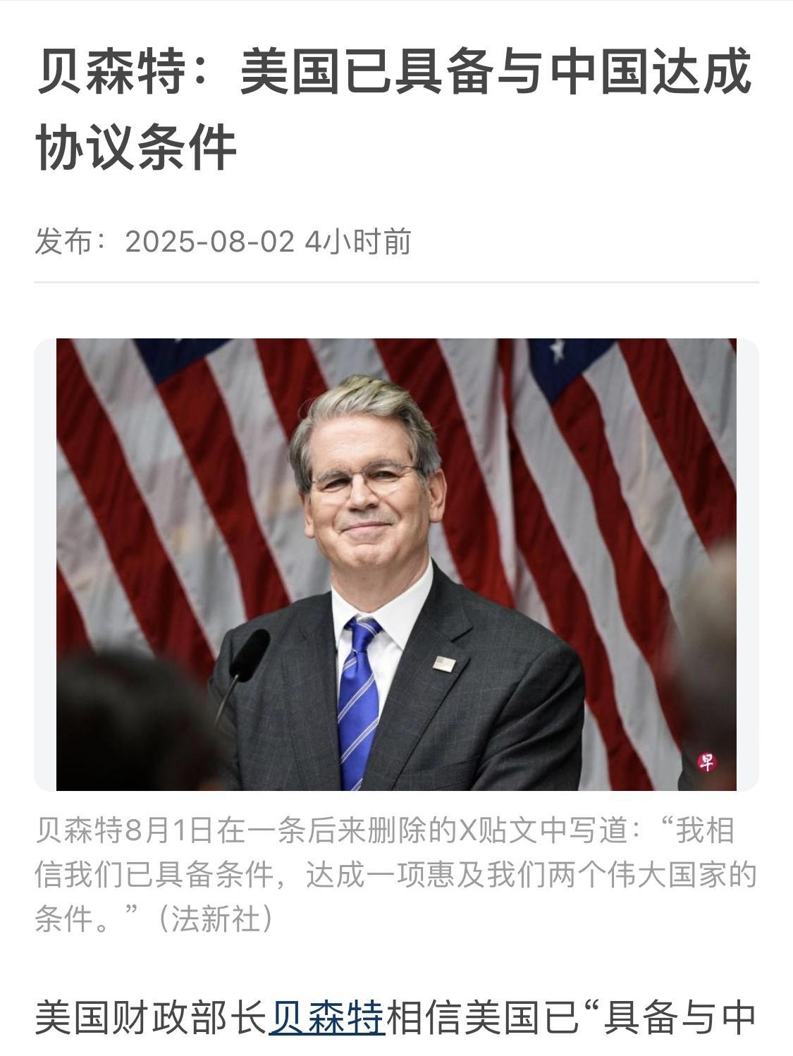 #头号创作者激励计划# 美国财长贝森特透露说,美国已具备与中国协议的条件,并对未