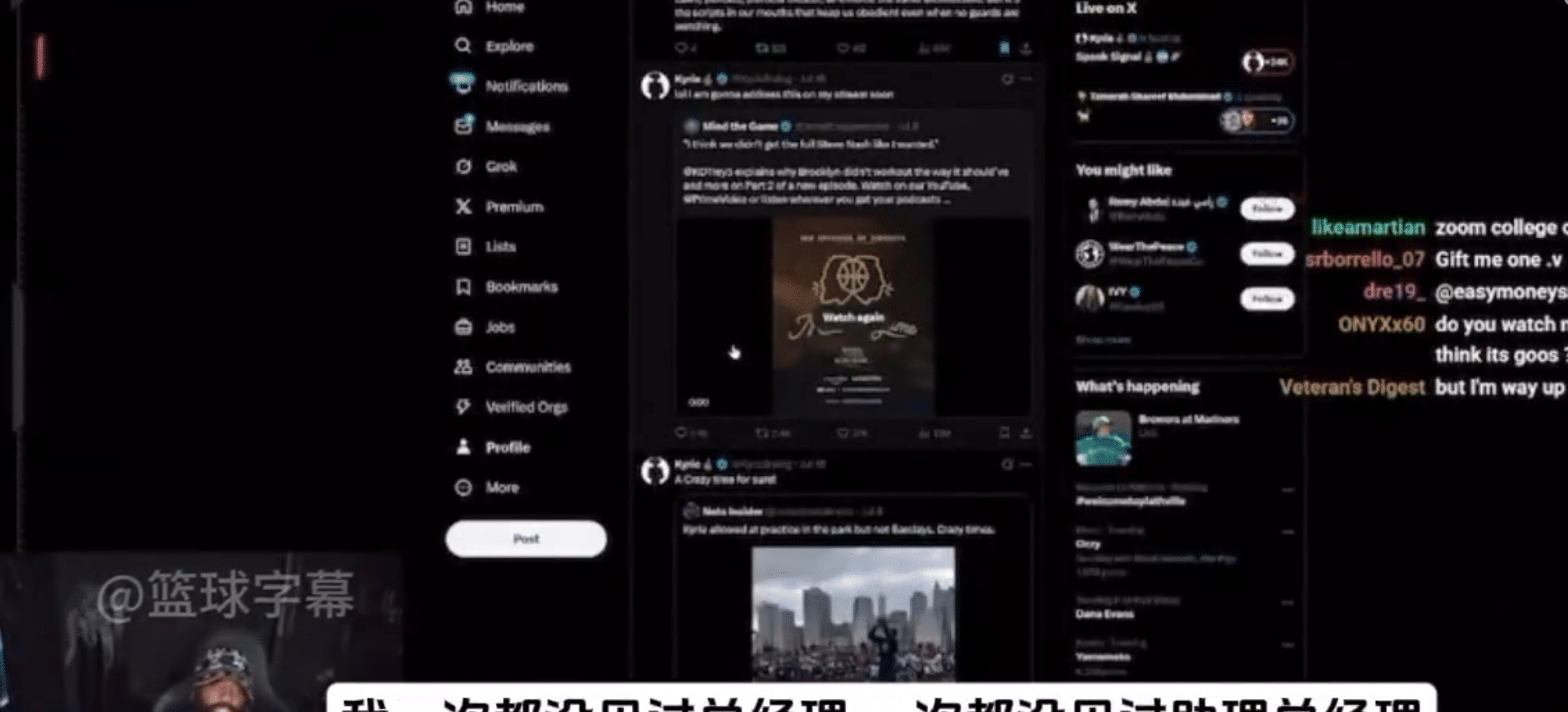 在直播时,欧文坦言,在他决定加盟篮网之前,实际上与球队的管理层只见过一次面,他甚至表示自己从未与篮网的总经理或者助理经理进行过面对面的沟通。他回忆起这个决定时,觉得自己应该花更多的时间去了解管理层的真实想法,寻找最利于自己的选择。他谈到和杜兰特一同加盟篮网时,正值杜兰特经历了跟腱断裂的重创,他表示自己对于朋友的支持,愿意为杜兰特的恢复耐心等待。他坦言,身边的朋友需要时间来康复,而他会做到始终陪伴在身边。回想当时,欧文觉得自己应该更深入地了解球队,因为实际上管理层对他的态度并不热情,这也是他后来离开的原因之一。