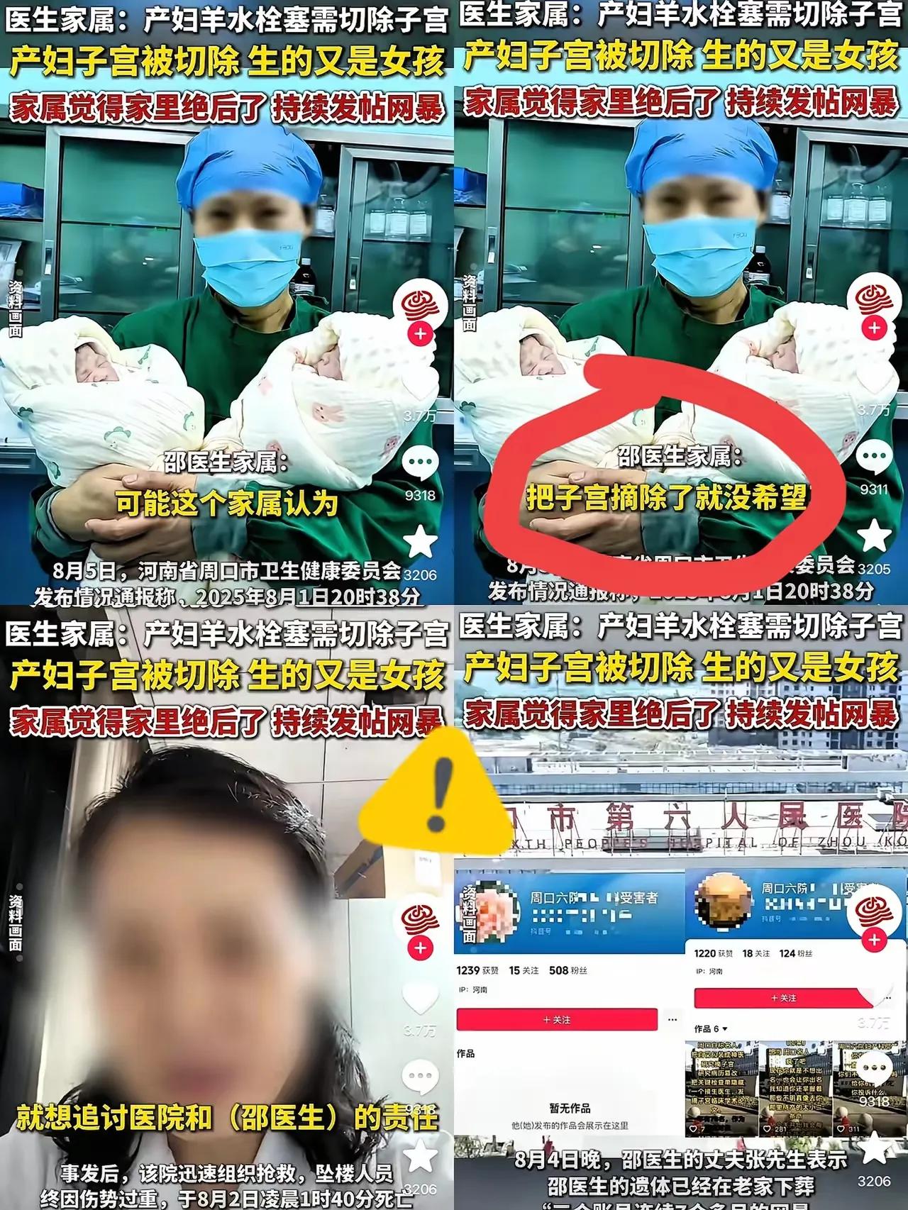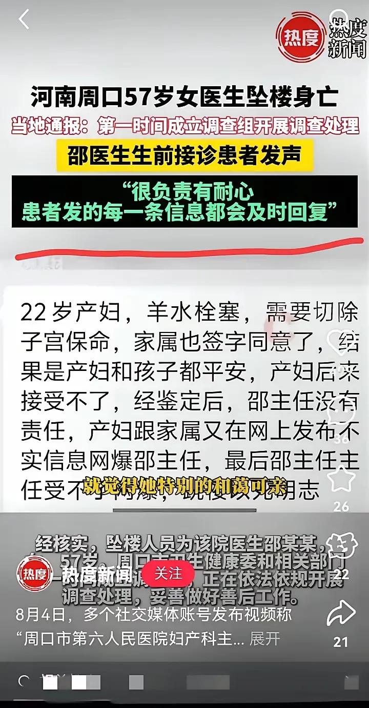 邵医生跳楼轻生,那个顺利接生超过8000个婴儿的邵医生,本是“送子观音”在世,却被网暴长达7个月之久,最后跳楼结束自己的生命,丈夫说她太绝望了,没有人能帮她。 产妇羊水栓塞——羊水倒灌入血管,血压瞬间崩盘,全身凝血崩溃,母子马上命悬一线!邵医生为了既救孩子又保大人,在征得家属同意的情况下果断切除产妇子宫,既救了母亲,也救了胎儿,本是两全其美的事情,却被说成别有用心。 邵医生一生光明磊落,想不到遇到了别有用心的坏人,去年冬天,一位产妇突发羊水栓塞,邵医生告知家属需切除子宫以保大人性命,家属签署同意书后产妇顺利生产。 但术后家属以娶媳妇花费高且只生女儿无法再生儿子为由,要求邵医生和医院赔偿100万,住院期间便在抖音发布不实信息博同情,出院后还将两家医院告上法庭。虽一个多星期前合肥司法鉴定专家初步结论此事与妇产科无关,但家属仍在抖音控诉“医生故意切除器官”等。 除此之外,还有两起医闹都直指邵医生,一个两年后患儿确诊脑t,未做鉴定直接把原因归结到生产过程。 一个因为胎儿太大邵医生建议刨妇产,但产妇及家人拒绝,最终致胎儿死亡(签了风险书)。 三个账号,连续7个月的网暴(含个人信息被公开),换作谁都受不了这样的打击,邵医生轻生当天还做完当天的手术,提前写好了遗书,写下了三起医闹起因,让丈夫帮她正名,她还和孙子打了视频通话,还在抖音上发布了一条告别视频。她真的很敬业,很热爱她的工作,也很爱她的家人,就这样一个医术高又心地善良的好医生,直接被网暴死亡,实在是悲哀。 邵医生真的不值得,对于恶人来说,他们认为是你的错,就算你死了他们都不觉得愧疚,只会眼巴巴瞅着自己失去的,她以死明志也无法改变产妇家要生一个男孩延续香火的想法。改变不了他们的认知,可怜的是邵医生和她的家人。