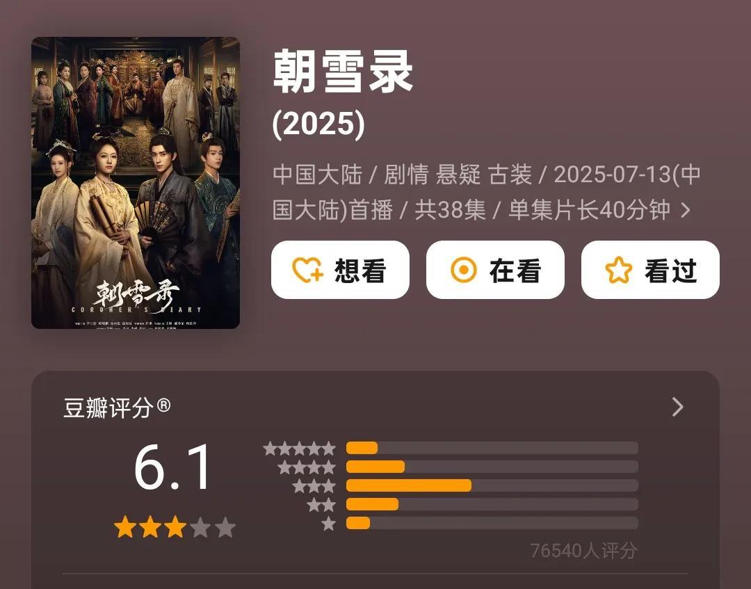 据说,爱奇艺官方认证的2025年暑期三大爆款剧分别为,口碑6分的《临江仙》,口碑7.1分的《书卷一梦》和口碑6.1分《朝雪录》。 这三部剧里,我觉得《临江仙》就算了,开闸放水的爆款,除了炒作,对于故事似乎没有多少人关注。而于正下场手撕观众的行为,确实有点难看。 像《书卷一梦》和《朝雪录》这两部剧,热度完全是依靠故事撑起来的,演员方面的炒作也有,但很少,毕竟像刘宇宁李一桐,李兰迪敖瑞鹏,这都不是大流量明星,捆绑也很浅。 我总感觉,白鹿的剧每次热度挺高,最后口碑却很惨,太能炒作真的很影响观感。古偶剧里泡久了,演技方面根本没有多少突破,要不干脆待在综艺里别出来了。