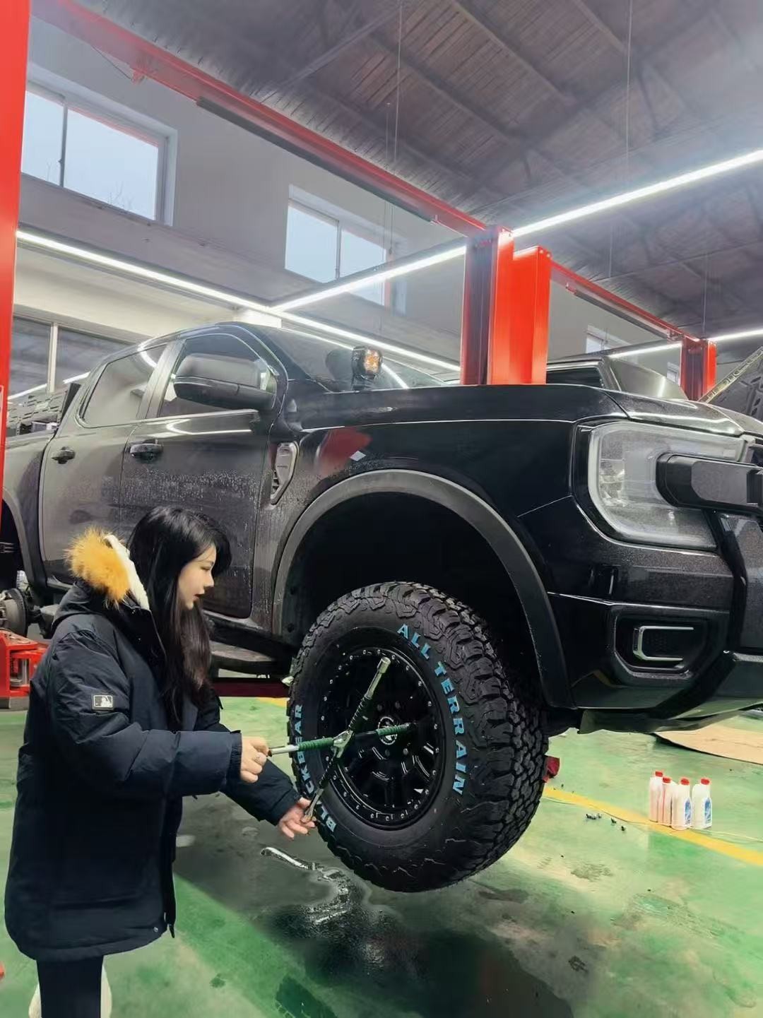 轮胎换成了黑熊AT胎,这是我最不后悔的改装!颜值和轮毂完美适配,城里开完全不吵,滤震柔和,避开了AT胎的常见短板;到了非铺装路,抓地力立马在线,沙地、泥地都能稳稳拿捏,对女生来说,舒适与安全双满足。