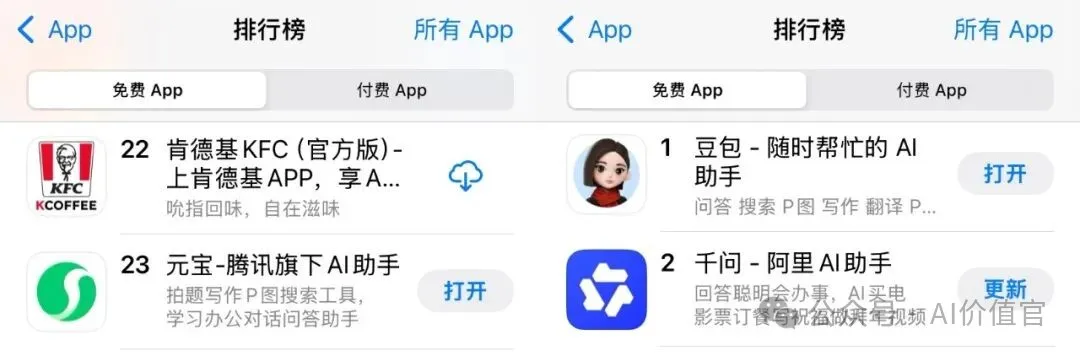仅从App Store排名来看,三位“参赛选手”已然分化成为两个阵营——豆包、千问稳居前两名,而元宝则滑落到了20名之外。虽然这只能代表一时下载量的高低,但至少能管窥红包攻势之后AI助手热度的变化。