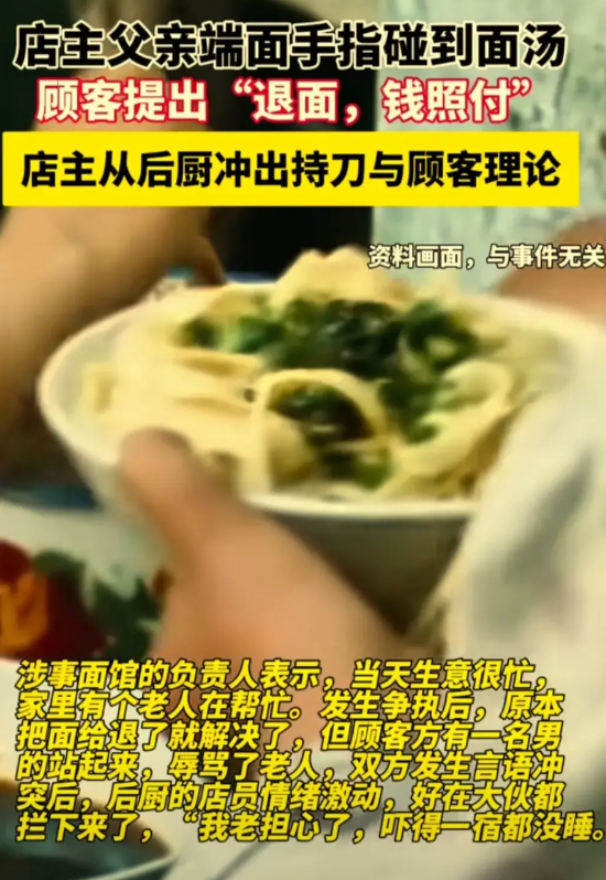 8月10日,在辽宁本溪,几名游客去一家饭馆吃饭,在上餐的时候店主父亲端面条出来,端碗的时候手指碰到汤上面,顾客看到后表示这个面退了,他不吃了,钱他可以照付。 双方发生了言语争执,老人儿子觉得父亲遭到了欺负,在后厨拿了一把菜刀冲出来理论,旁边人惊呼:这是干啥呢,怎么动刀呢? 饭馆负责人说:由于当天饭馆很忙,家里老人来帮忙,结果因为这个事情发生了争执,本来打算退了就完事了,顾客当中有一人辱骂了老人。 后厨店员情绪激动,双方就发生了言语冲突,好在大家拦了下来,也没有发生什么事,他吓得一晚上都没睡好。 当地派出所工作人员说,此事已经处理完毕,并向当事人进行了解释。