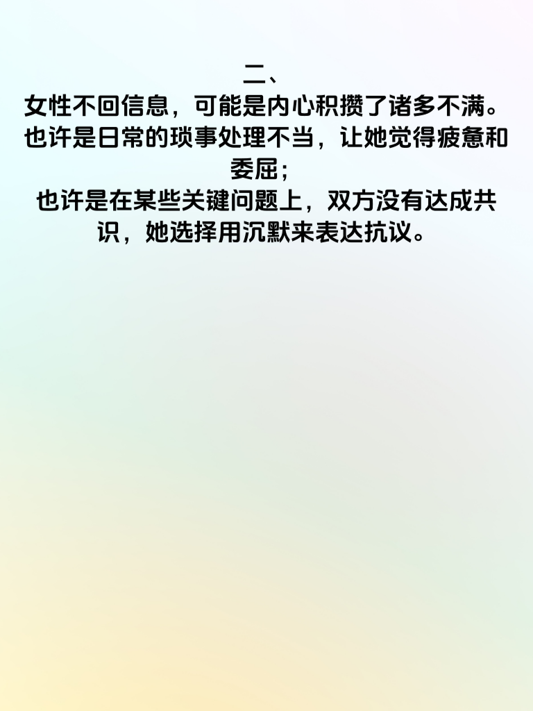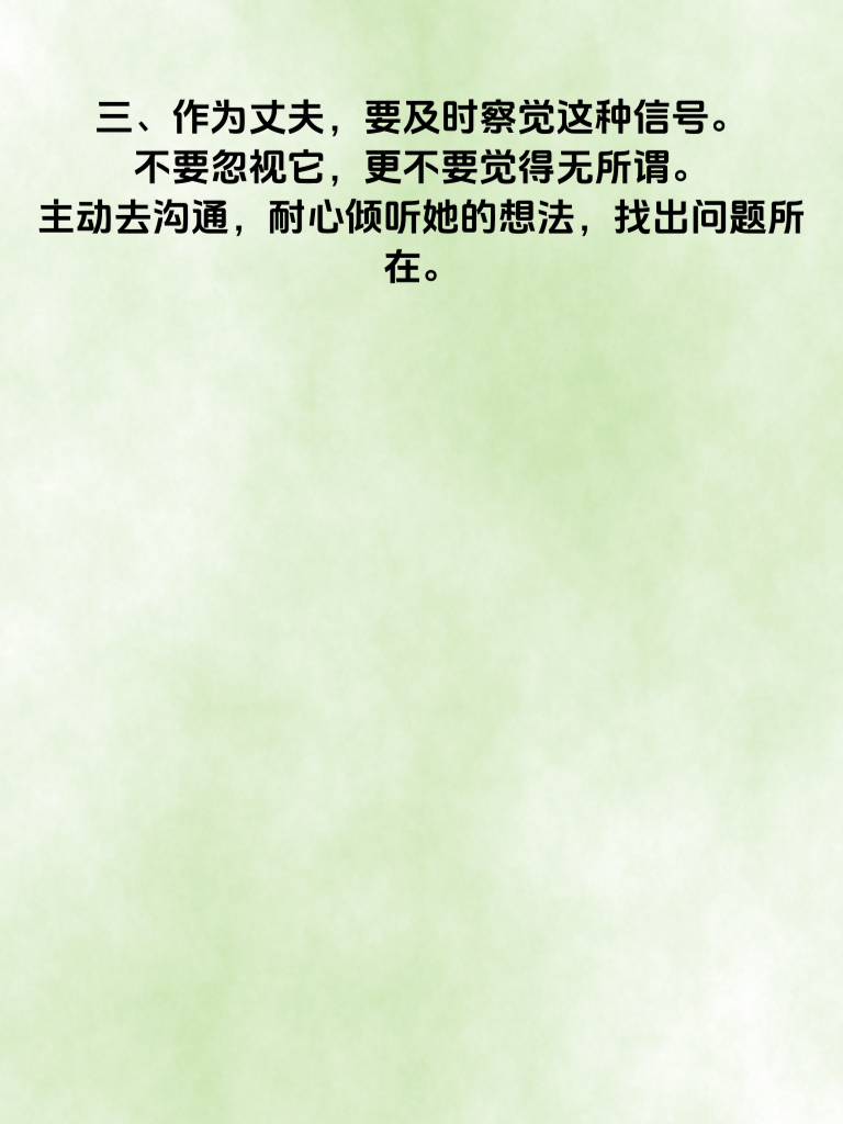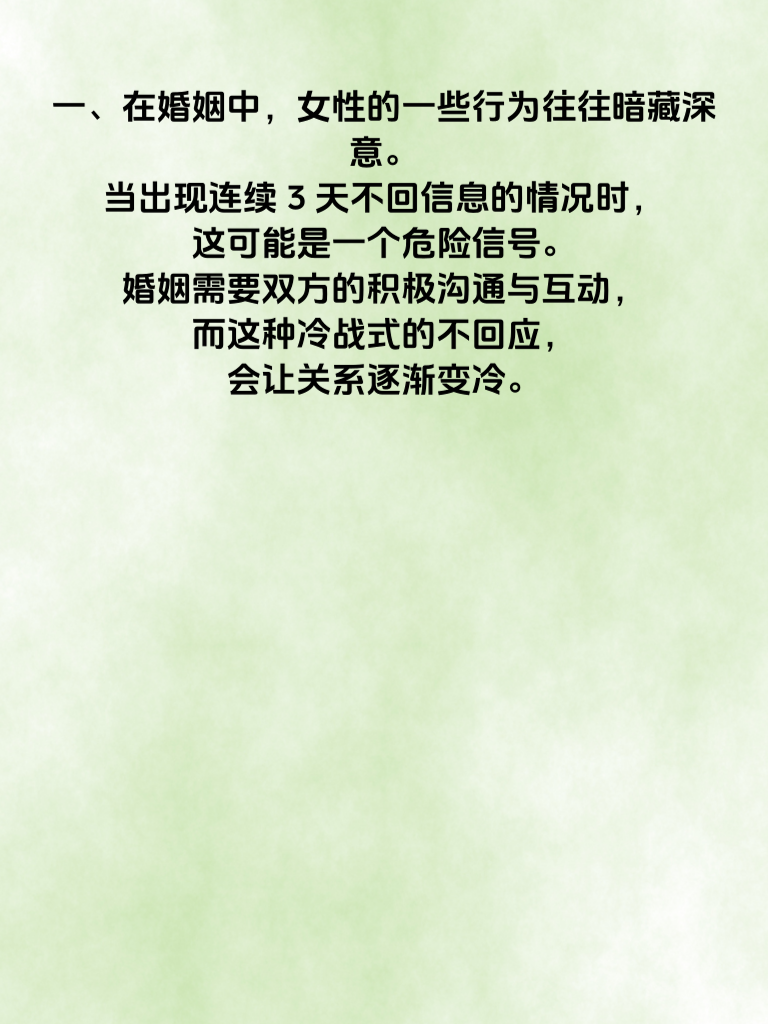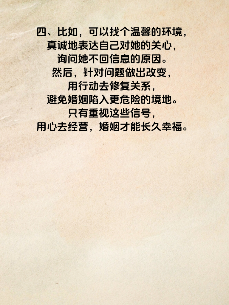 一、在婚姻中,女性的一些行为往往暗藏深意。当出现连续3天不回信息的情况时,这可能是一个危险信号。婚姻需要双方的积极沟通与互动,而这种冷战式的不回应,会让关系逐渐变冷。 二、女性不回信息,可能是内心积攒了诸多不满。也许是日常的琐事处理不当,让她觉得疲惫和委屈;也许是在某些关键问题上,双方没有达成共识,她选择用沉默来表达抗议。 三、作为丈夫,要及时察觉这种信号。不要忽视它,更不要觉得无所谓。主动去沟通,耐心倾听她的想法,找出问题所在。 四、比如,可以找个温馨的环境,真诚地表达自己对她的关心,询问她不回信息的原因。然后,针对问题做出改变,用行动去修复关系,避免婚姻陷入更危险的境地。只有重视这些信号,用心去经营,婚姻才能长久幸福。