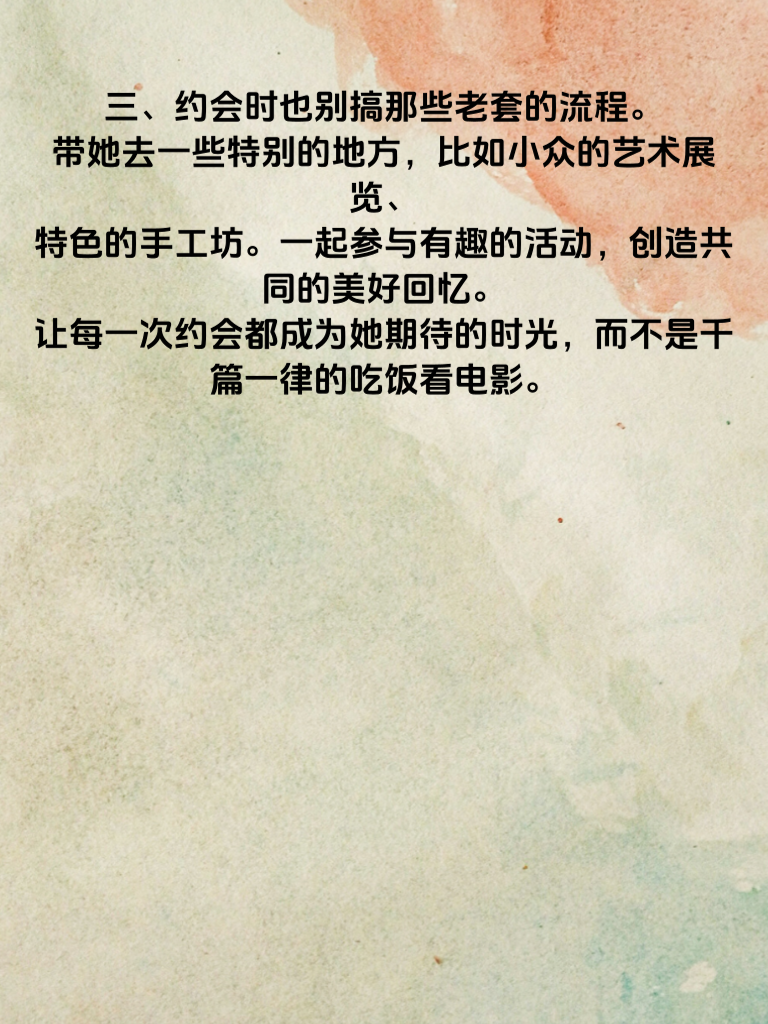 一、属兔的小伙伴们,下半年可是脱单的好时机哦!想要告别无聊的追求方式,那就得好好下功夫啦。首先,要明白女生大多喜欢有趣、有内涵的男生。所以,丰富自己的生活,培养各种兴趣爱好,让自己变得更加有魅力。 二、聊天是拉近彼此距离的重要环节。拒绝单调乏味的开场白,不要总是问一些无聊的问题。可以从她感兴趣的话题入手,比如她喜欢的电影、音乐、美食等。用心倾听她的想法,分享自己的见解,让聊天充满乐趣。 三、约会时也别搞那些老套的流程。带她去一些特别的地方,比如小众的艺术展览、特色的手工坊。一起参与有趣的活动,创造共同的美好回忆。让每一次约会都成为她期待的时光,而不是千篇一律的吃饭看电影。 四、最重要的是,真诚待人。用真心去对待她,让她感受到你的爱意与关怀。在追求的过程中,展现出你的独特之处,拒绝无聊的套路,相信属兔的你一定能在下半年成功脱单!