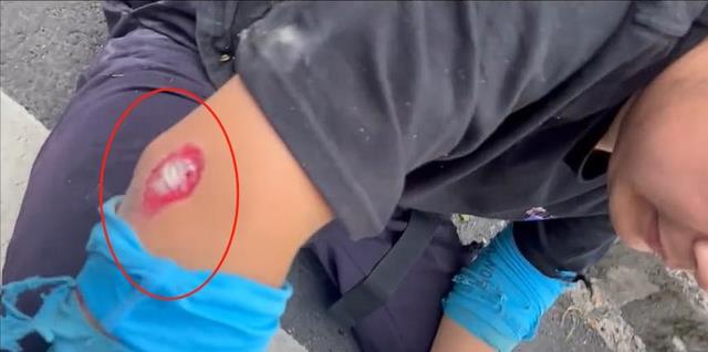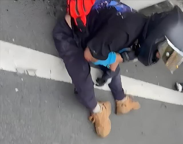 被撞的摩托车骑手在事故后,为了安全起见迅速爬向路边。