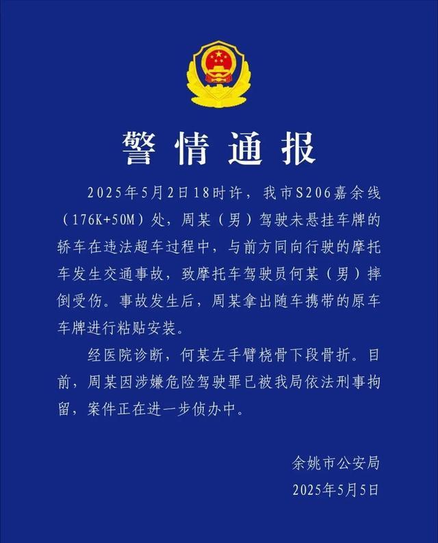 5月5日余姚警方发布通报,确认肇事司机周某因“未悬挂车牌”和“违法超车”被刑事拘留。