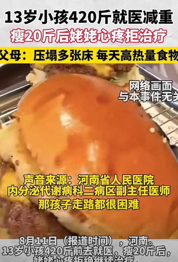 河南,13岁孩子体重达到420斤,一顿三个汉堡,一天一大瓶可乐,压塌了几张床铺,孩子走路都困难,父母把孩子送到医院减肥,一个多月,减了20斤。