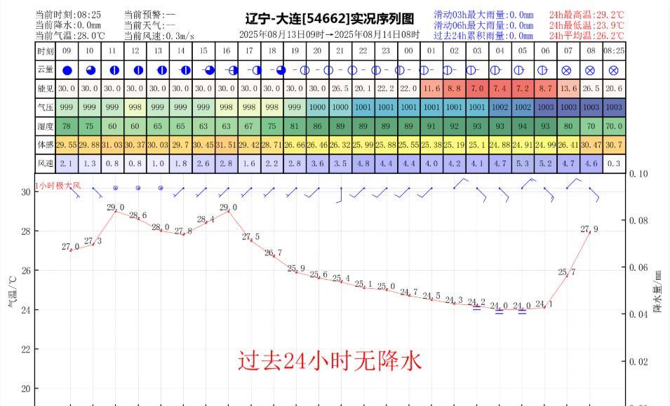 昨日官方预报:大连8月13日白天到夜间多云间晴,白天有分散性小阵雨,偏南风4到5级,最高气温:29℃,最低气温:24℃。实况:多云有时阴,14日凌晨转晴,最高气温:29.2℃,最低气温:23.9℃,平均气温:26.5℃,空气质量:良,AQI平均:55。