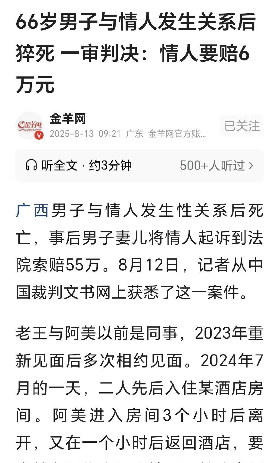 广西,一66岁男子与女同事开房,俩人发生好几次关系,然后呼呼大睡,3小时后,女同事醒来,发现男子呼噜声停止,大腿上有黑点,女子心里害怕,拔腿就跑,回到家里,她坐立不安,一小时后又回来,她叫上前台,一起和她进房间看,发现男子急性心肌梗死,已经死亡,家属告上法院,向女同事和酒店索赔55万,女同事心里委屈: 他死亡时,我没睡醒,无法施救,我血压高,回家吃降压药……法院这样判了! 别看老王已经66岁,可他并没有觉得自己老了,在他心里,还是少年,他蠢蠢欲动,寻找着机会。 2023的一天,老王看见前同事阿美,他心里激动,和阿美聊起了过去的事情。 他们曾经在一起工作,有共同语言,感叹过去年轻,美好的时光,一晃而去。 从此以后,俩人经常见面,一来二去,俩人有了感情。 2024年7月,俩人相约,来到了一家酒店,开了一间房子,俩人走了进去。 虽然他们都有家庭,可是,家里的人已经成为了亲人,早已没了感觉,不能像年轻时那样,充满了激 情。 俩人心想,彼此已经都不年轻,趁着身体还好,能享受一天,就享受一天,不求天荒地老,只求眼前的快乐。 到了房间,俩人干柴烈火,发生了多次的关系,老王累的气喘吁吁,躺在床上,沉沉睡去。 不大一会,呼噜声响起,阿美一听,老王呼呼大睡,她睡到另一张床上,渐渐进去梦乡。 这一觉睡的甘甜,阿美醒来,看了下表,时间过去了3个小时。 她起身一看,老王依旧闭着眼睛,可是,呼噜声已经停止。 阿美心里一惊,突然感觉不好,她又仔细一看,老王大腿上出现了黑点。 阿美怕了,她心里断定,老王已经死亡,她心里慌张,冒出一头的冷汗。 她收拾好东西,立刻离开,一口气回到家里,想平复一下心情。 可是,她越想越怕,根本在家里待不下去了,她一看表,已经过去了1个小时。 她心里难过,总归是相处一场,不能把老王一个人留在酒店。 再说,他们在酒店也有登记,到处都有摄像镜头,一旦老王被发现死在酒店,阿美离开,反而有了嫌疑。 阿美又匆匆赶回了酒店,她不敢单独进去,叫上了前台,一起走进房间。 前台进去一看,老王依旧在床上躺着,前台叫了他几声,老王毫无反应。 急救车和民警赶来,医务人员发现,老王已经死亡,死亡原因,是心肌梗死。 随后,阿美配合警方做了笔录,她如实陈述,她和老王发生了多次关系。 事发过后,她和老王沉沉睡去,等她醒来,发现老王呼噜声停止。 之后,她又看到老王大腿上有黑点,她自行判断,老王已经死亡。 可是,阿美自称,她也第一次遇见这种事情,心里慌张,无比的害怕,她本身有高血压,因为紧张,血压忽的升高。 她之所以回家,是回去吃降压药了,她不放心,吃完药后,又赶紧赶回来。 可是,老王的家属不愿意了,家属告到法院,要求阿美和酒店赔偿55万。 阿美十分委屈,她认为老王死时,她正在睡觉,没有睡醒,根本不知道老王已经心梗。 等她醒来,老王已经死亡,已经来不及救治,她并不知道老王有病,也不能预测到他会死亡。 并且,阿美认为,自己有高血压,突然发现老王死亡,心里害怕,血压升高,立刻回家是吃降压药去了,并不是故意不予救治。 那么,这件事在法律上是怎么认定的呢? 《民法典》第1165条规定:行为人因过错侵害他人权益造成损害的,应当承担侵权责任。 阿美与老王作为共同活动的参与者,在老王突发疾病时,阿美负有合理的救助义务。 阿美在发现老王呼噜声停止、大腿出现黑点时,应意识到异常情况,有义务采取急救措施,如拨打120急救电话。 但是,阿美未及时救助老王,反而离开现场回家,导致错过最佳救治时间,存在未履行注意义务的过错。 因此,阿美的过错行为与老王死亡后果之间存在一定因果关系,但老王自身突发疾病是主要原因,阿美责任为次要原因。 《民法典》第1198条规定:宾馆、商场、银行、车站、机场、体育场馆、娱乐场所等经营场所、公共场所的经营者、管理者或者群众活动的组织者,未尽到安全保障义务,造成他人损害的,应当承担侵权责任。 酒店作为经营场所,需要保障场所设施安全、提供基本服务,但是,酒店无法对每个房间内的客人进行实时监控。 因此,老王在房间内突发疾病,酒店无法预见或者干预。 并且,在阿美返回后,前台和她一同进入房间,发现老王叫不醒时,前台拨打了急救电话和报警,已经尽到协助义务。 酒店无证据显示存在管理过失,因此,酒店不构成侵权责任。 《民法典》第1173条规定:被侵权人对同一损害的发生或者扩大有过错的,可以减轻侵权人的责任。 老王作为完全民事行为能力人,应该知道自身的健康状况,但他仍然选择与阿美发生高强度活动,对他自身的死亡后果存在主要过错。 一审判决,酒店已尽到安全保障义务,无需承担赔偿责任,阿美应承担次要责任,赔偿家属60000元。 对此,你怎么看?关注@王哥说法 #头号创作者激励计划#