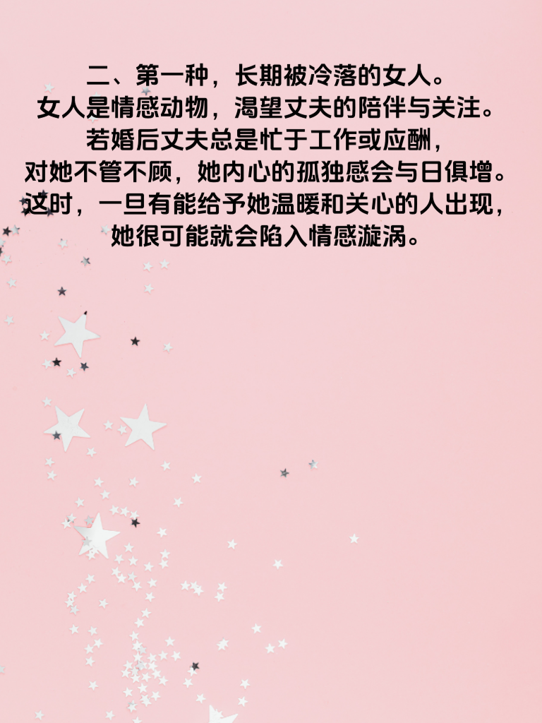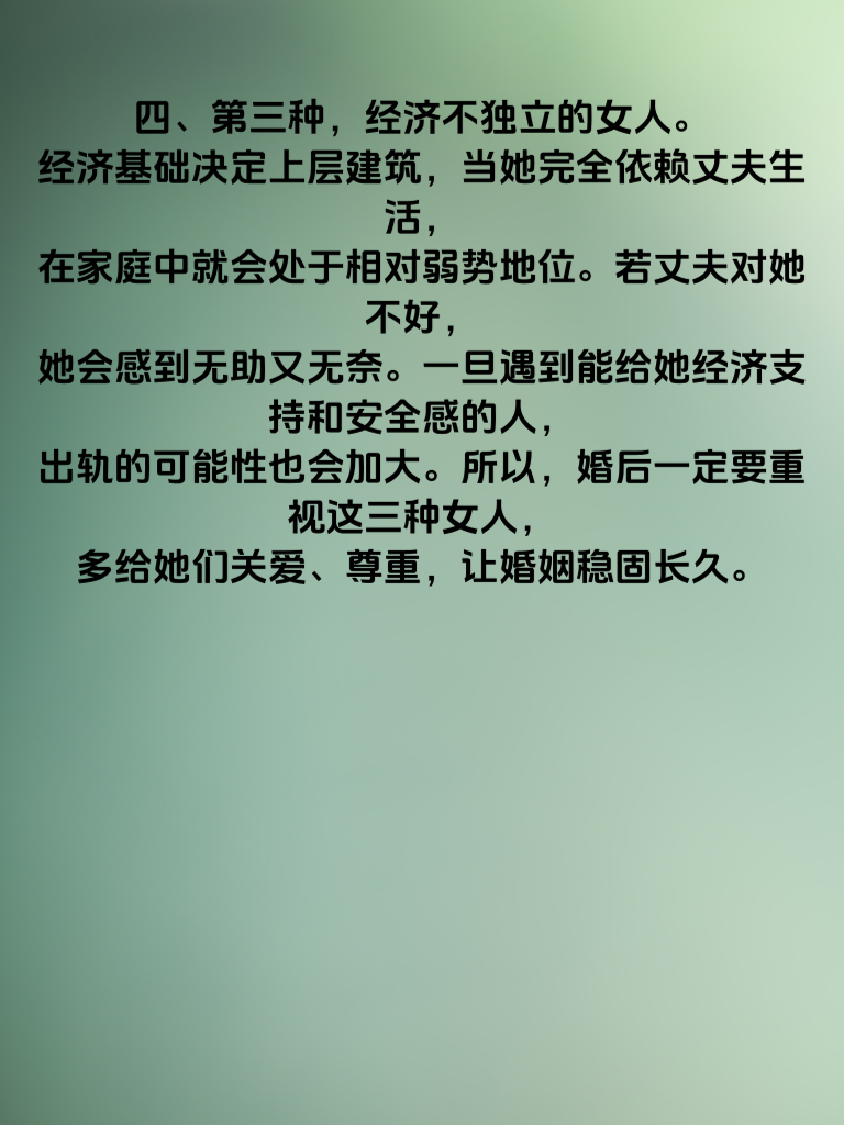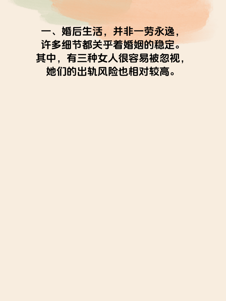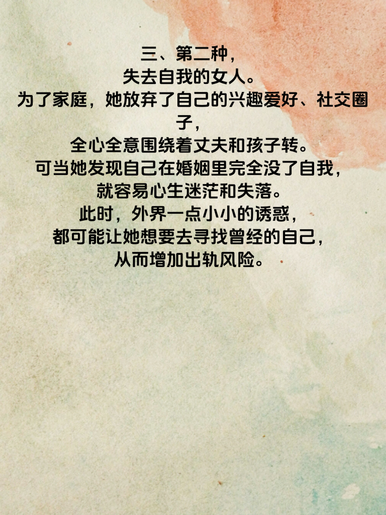 一、婚后生活,并非一劳永逸,许多细节都关乎着婚姻的稳定。其中,有三种女人很容易被忽视,她们的出轨风险也相对较高。 二、第一种,长期被冷落的女人。女人是情感动物,渴望丈夫的陪伴与关注。若婚后丈夫总是忙于工作或应酬,对她不管不顾,她内心的孤独感会与日俱增。这时,一旦有能给予她温暖和关心的人出现,她很可能就会陷入情感漩涡。 三、第二种,失去自我的女人。为了家庭,她放弃了自己的兴趣爱好、社交圈子,全心全意围绕着丈夫和孩子转。可当她发现自己在婚姻里完全没了自我,就容易心生迷茫和失落。此时,外界一点小小的诱惑,都可能让她想要去寻找曾经的自己,从而增加出轨风险。 四、第三种,经济不独立的女人。经济基础决定上层建筑,当她完全依赖丈夫生活,在家庭中就会处于相对弱势地位。若丈夫对她不好,她会感到无助又无奈。一旦遇到能给她经济支持和安全感的人,出轨的可能性也会加大。所以,婚后一定要重视这三种女人,多给她们关爱、尊重,让婚姻稳固长久。
