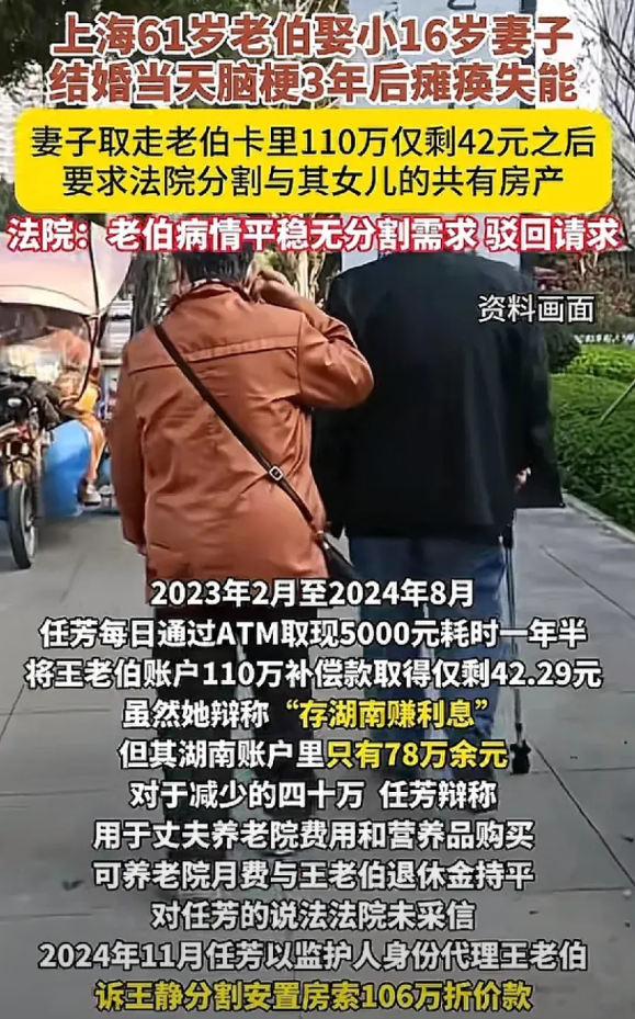 上海61岁的王大爷,在二婚当日突发脑梗,三年后完全失能,二婚妻子任芳便将王大爷送进了养老院。