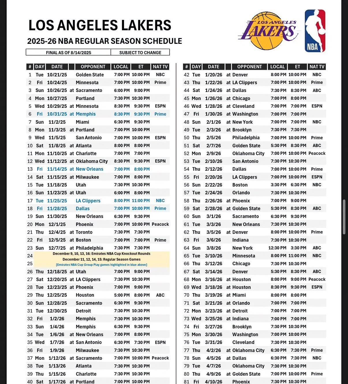 湖人2025-2026赛季完整版赛程壁纸新鲜出炉! 湖人2025 - 2026赛季完整版壁纸来了,喜欢的小伙伴可以去下载啦! 那么问题来了,新赛季的湖人又会打出什么样的成绩呢?#NBA热点# #湖人# #洛杉矶湖人# #NBA#