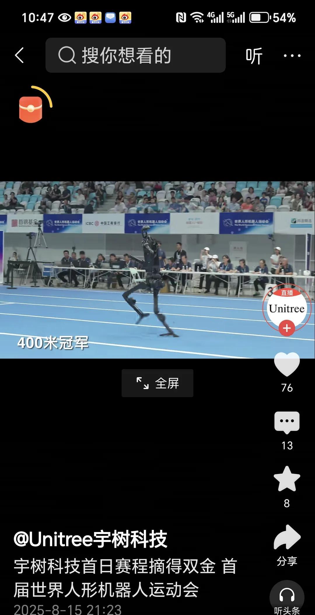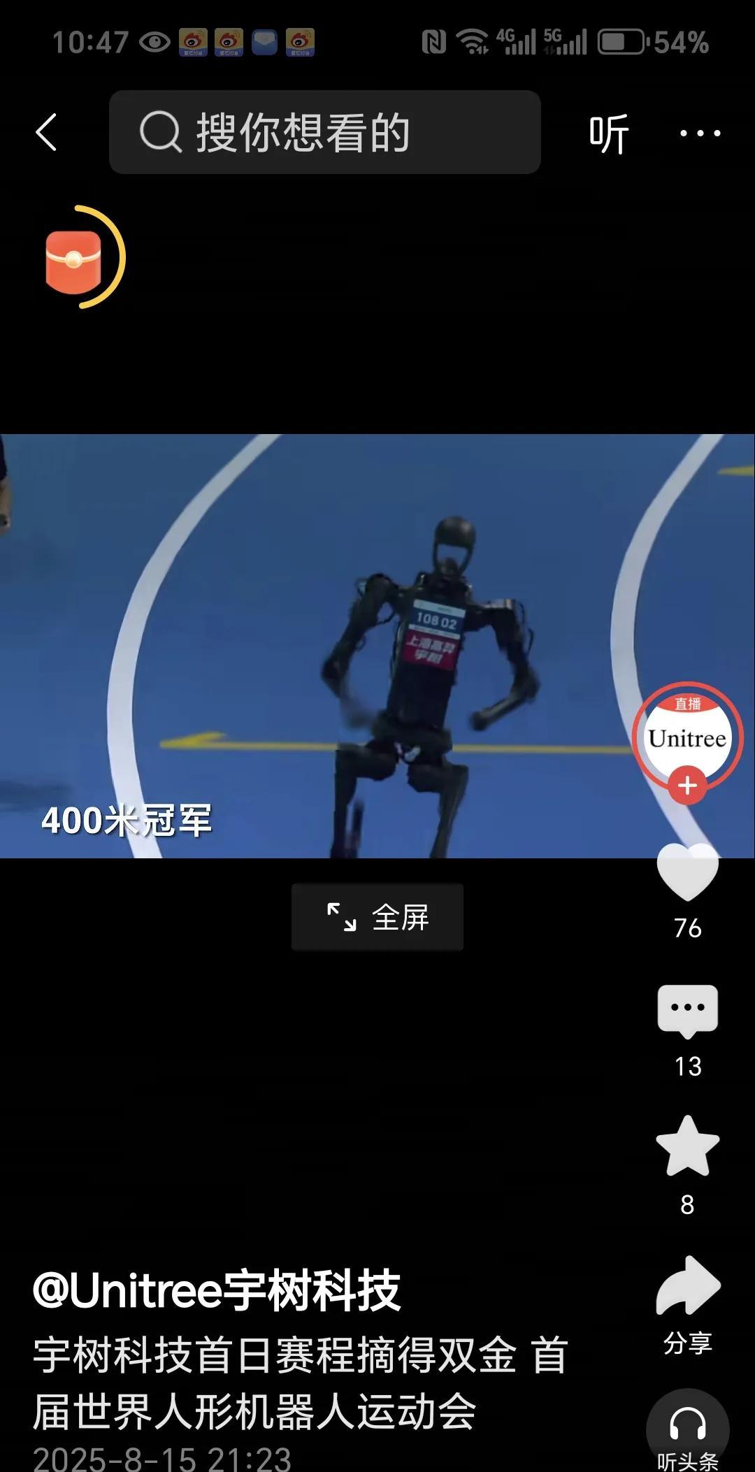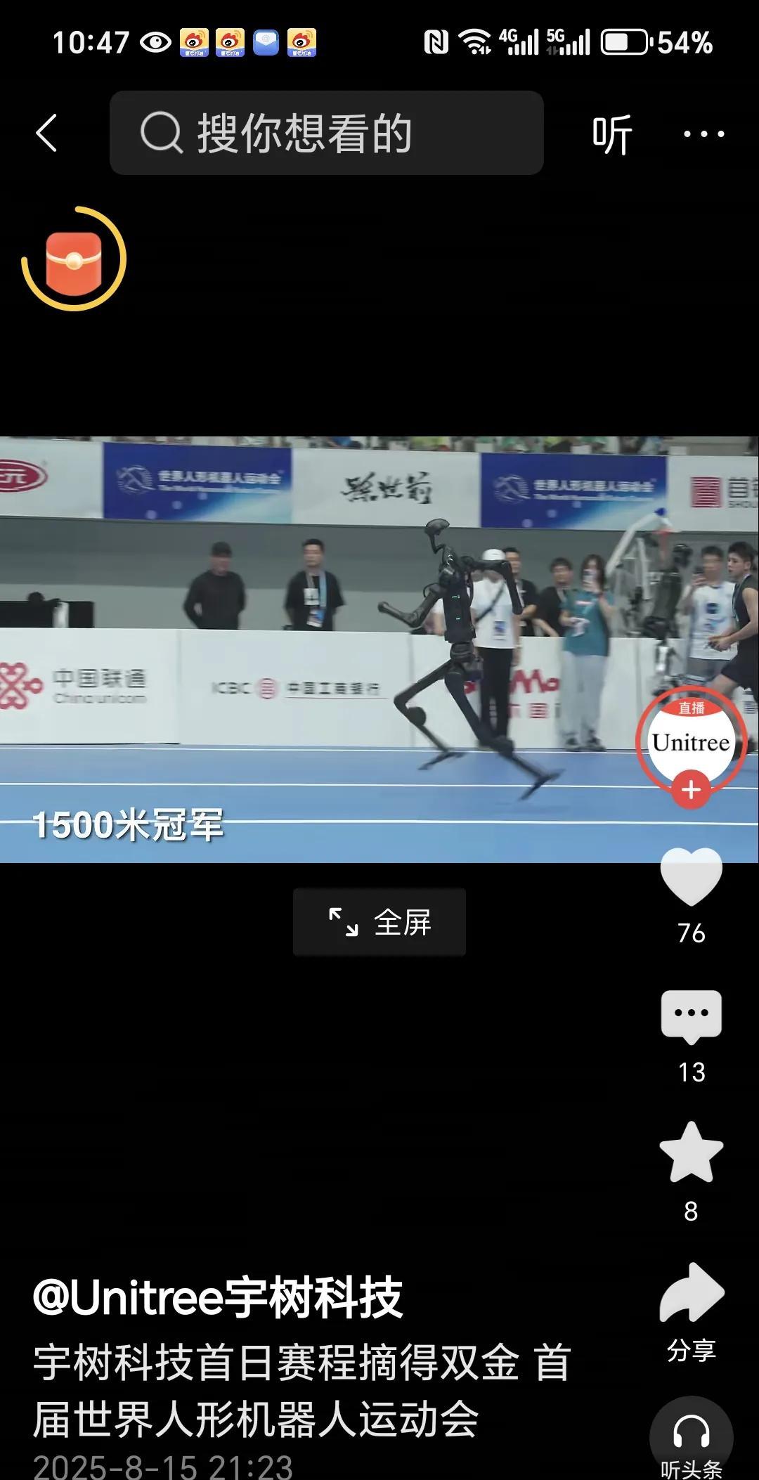 宇树科技的机器人真是牛逼, 首日就摘得两金。 从视频中可以看到宇树科技的这款机器人跑的速度确实飞快, 甚至比指挥它的人都跑得快。 指挥它的人都被他甩得远远的。 去年机器人走个路还摇摇晃晃, 需要两个人搀扶。 现在短短一年都进化的成了飞毛腿, 不敢想象再过几年人形机器人说不定就能够混在我们人类中间, 分辨不清谁是机器人谁是人了。
