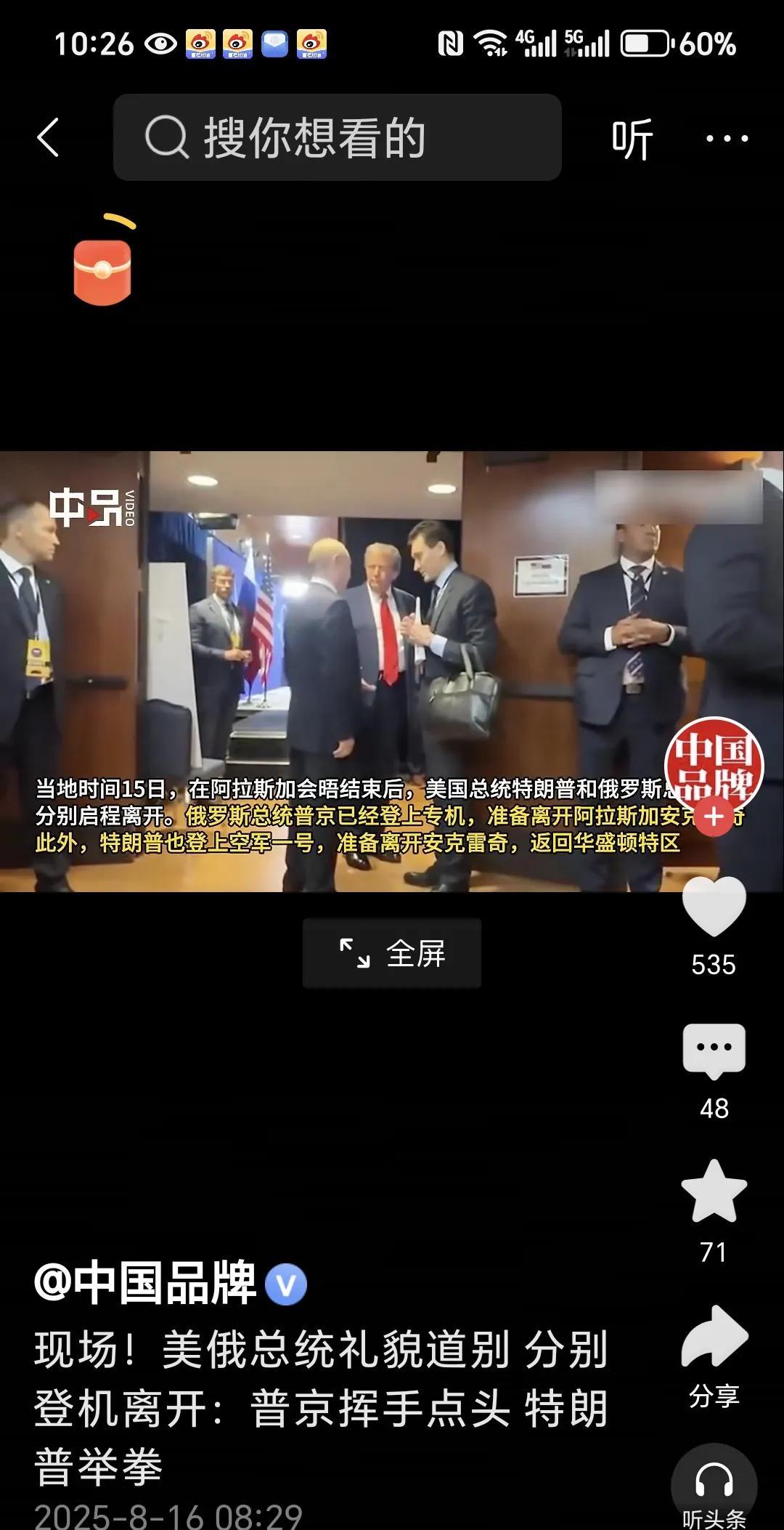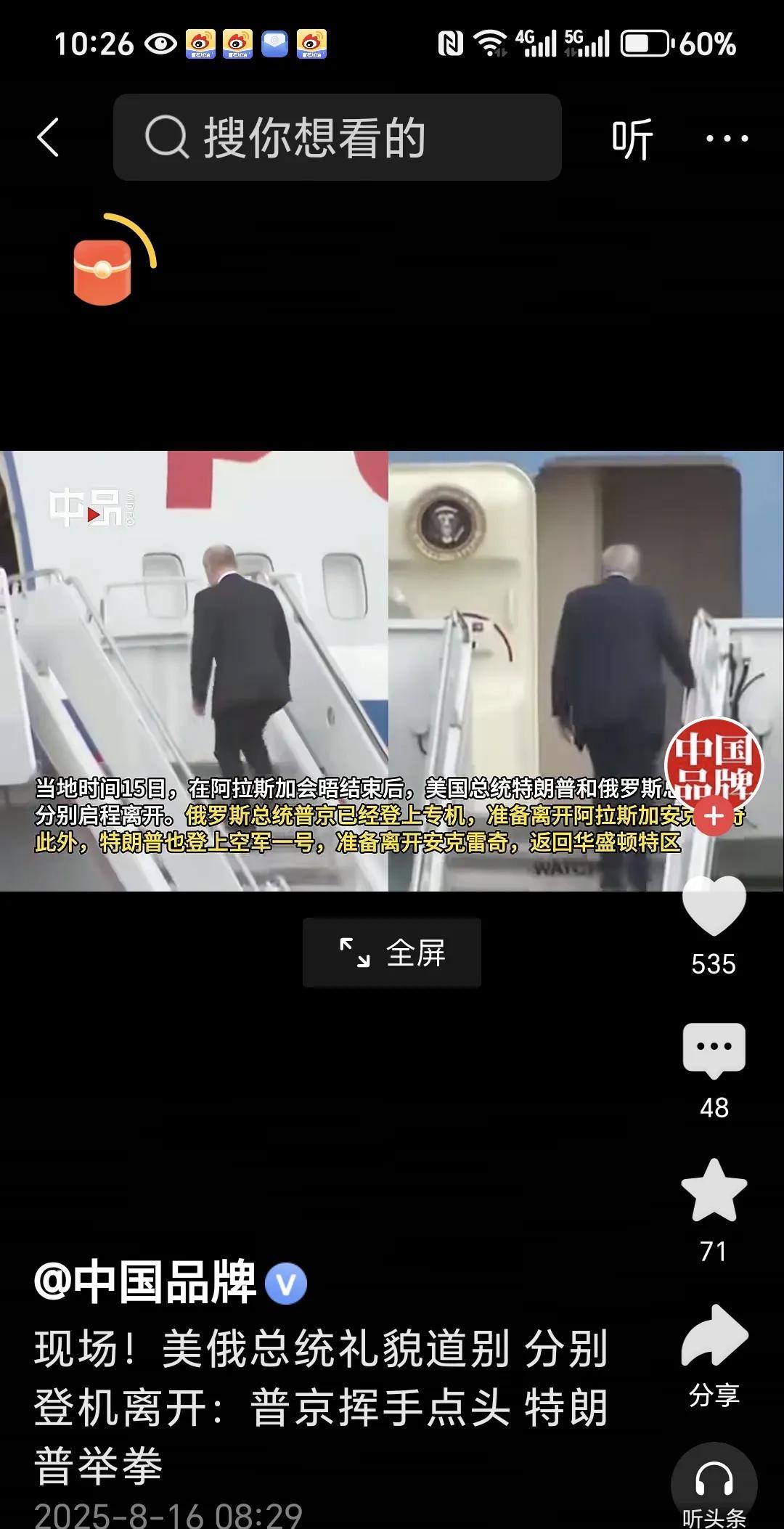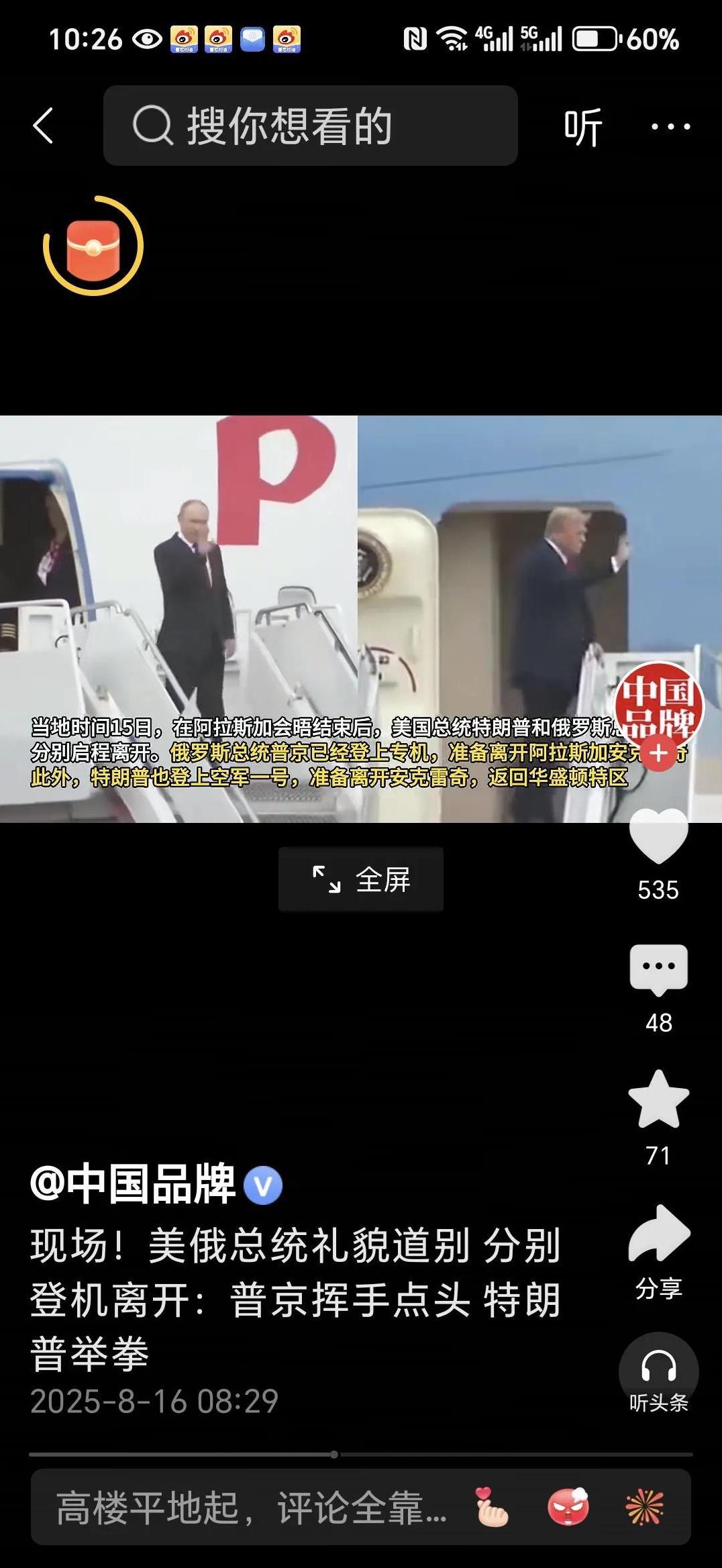 普京总统真是胆大啊, 根本无视国际刑事法院对他的逮捕威胁, 只身前往世界上最强大的美国阿拉斯加安克雷奇与特朗普进行会面, 这种危险不亚于三国时代关羽单刀赴会。 如今,在与美国总统特朗普进行两个小时的闭门会谈后, 他们两人已经礼貌性的握手话别。 而且美国总统特朗普认为他们在许多方面已经达成了协议。 相对来说,俄罗斯总统普京态度则比较谨慎。 随后两人分别乘坐各自专机返回。 普京挥手告别 特朗普挥拳告别 普京此行也是做足了准备, 不仅有战机护航, 而且还派出了核潜艇前去保卫俄罗斯海陆空。 三位一体核打击力量也随时处于待命状态。 即使是最强大的美国, 也未必敢动普京一根毫毛。 相信普京总统一定能够安全地回到莫斯科。